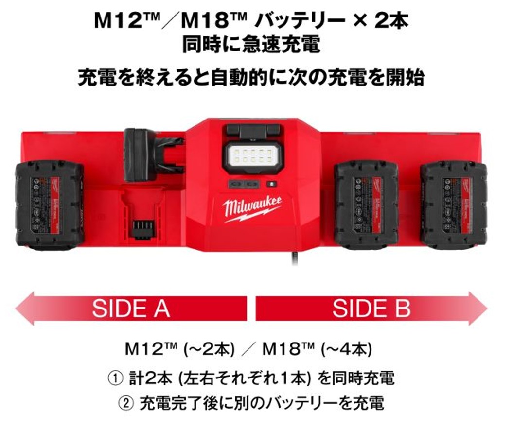 M18バッテリー×4本またはM12バッテリー×2本+M18バッテリー×2本の最大4本のバッテリー装着が可能で、2本同時の充電動作に対応します。