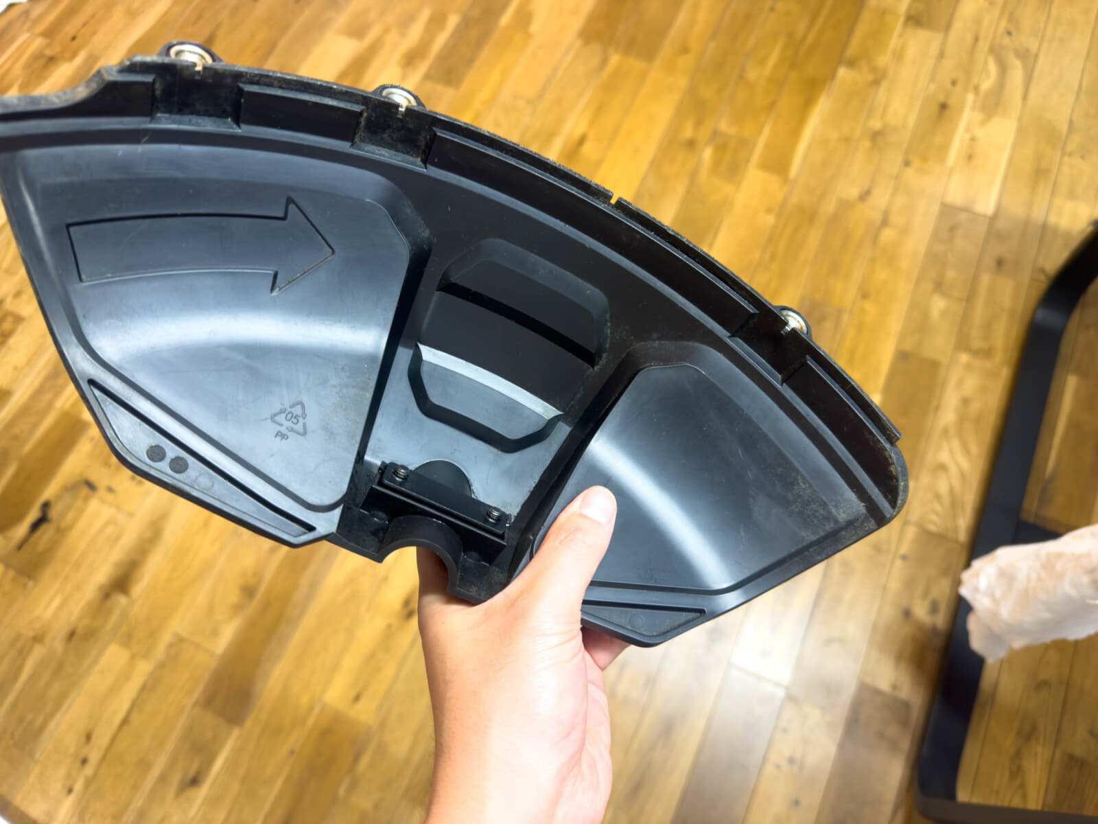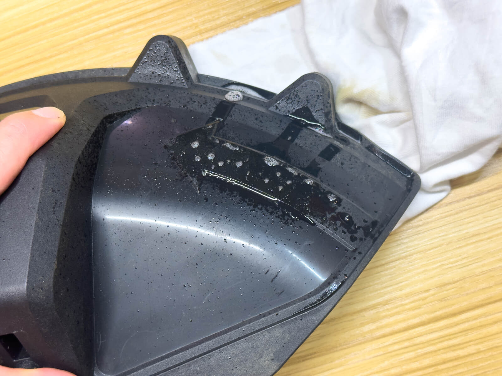 写真の飛散防止カバーはPP(ポリプロピレン)なのでアルカリ溶剤には良好な耐性がありますが、PC(ポリカーボネート)はアルカリに弱いため注意が必要です。例えば、電動工具用バッテリーは外装ケースにPCまたはPC+ABSが使われていることが多いので、バッテリーの汚れ落としには使わないようにしましょう。