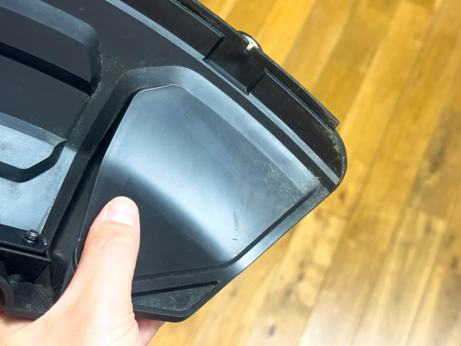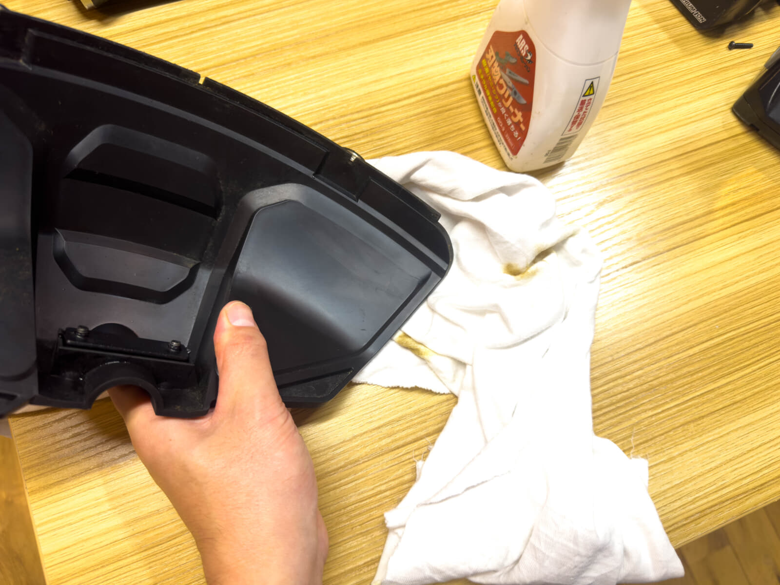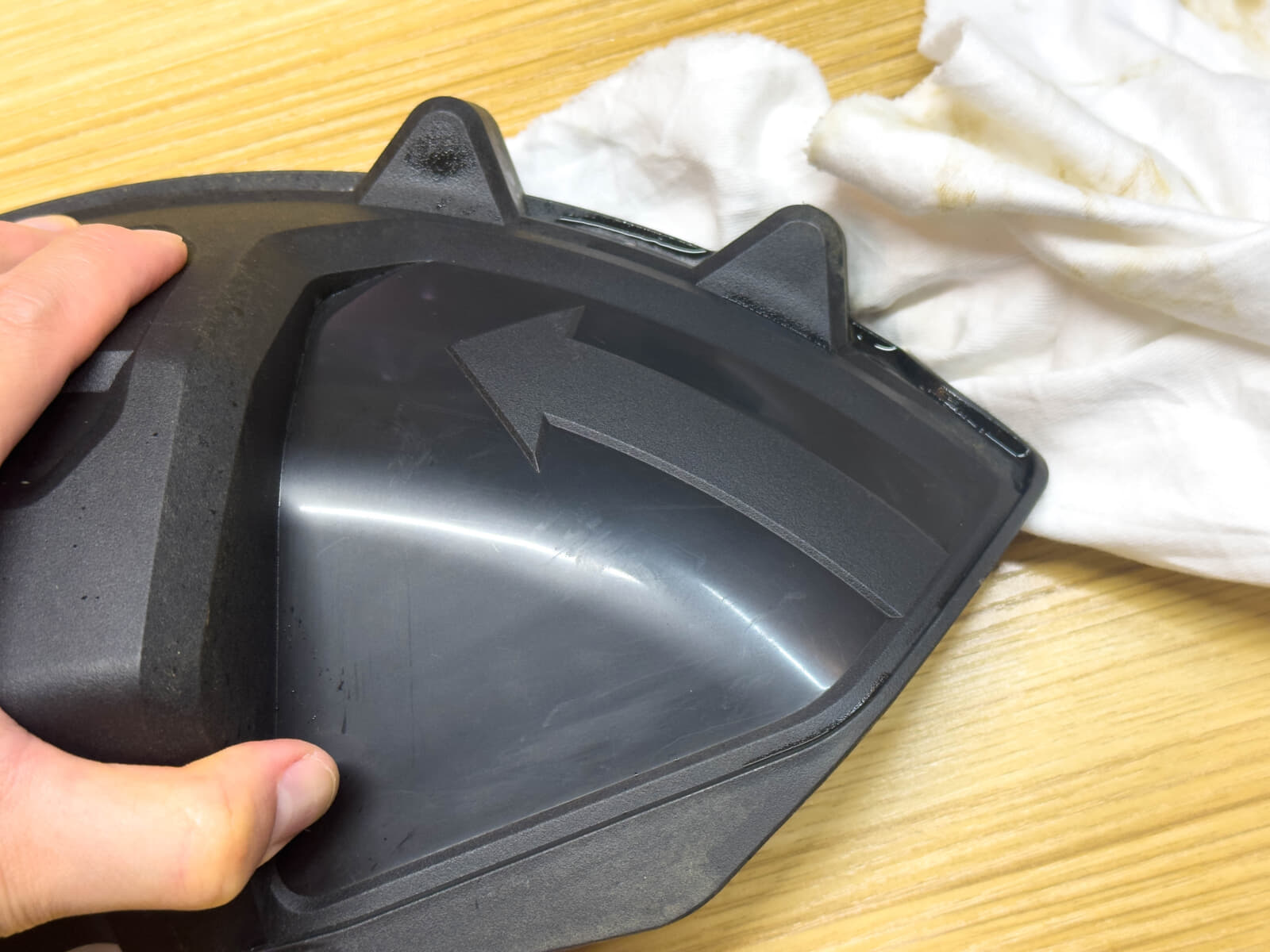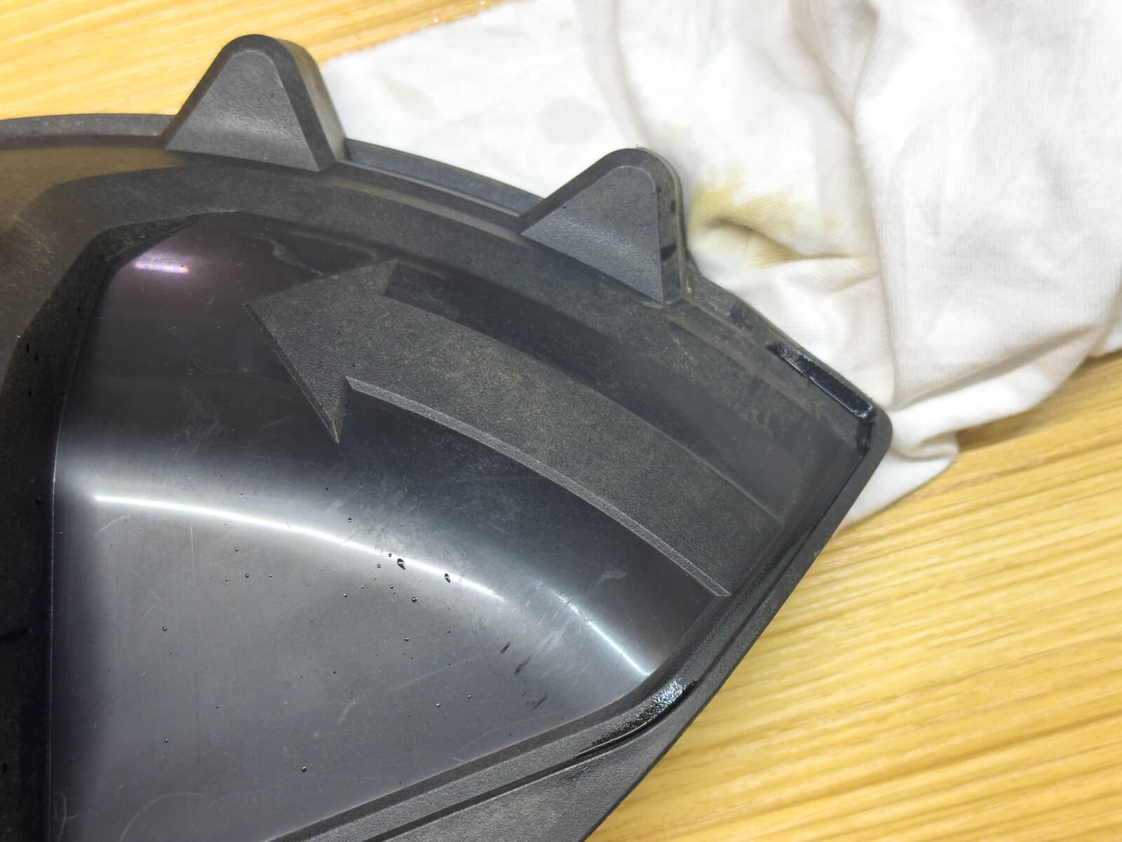 もう一か所も綺麗にしてみます。これはカバー上面のチップソー回転方向を表しているシボの部分です。この部分はざらざらしているため、一度汚れが付くと綺麗にするのが難しい部分です。