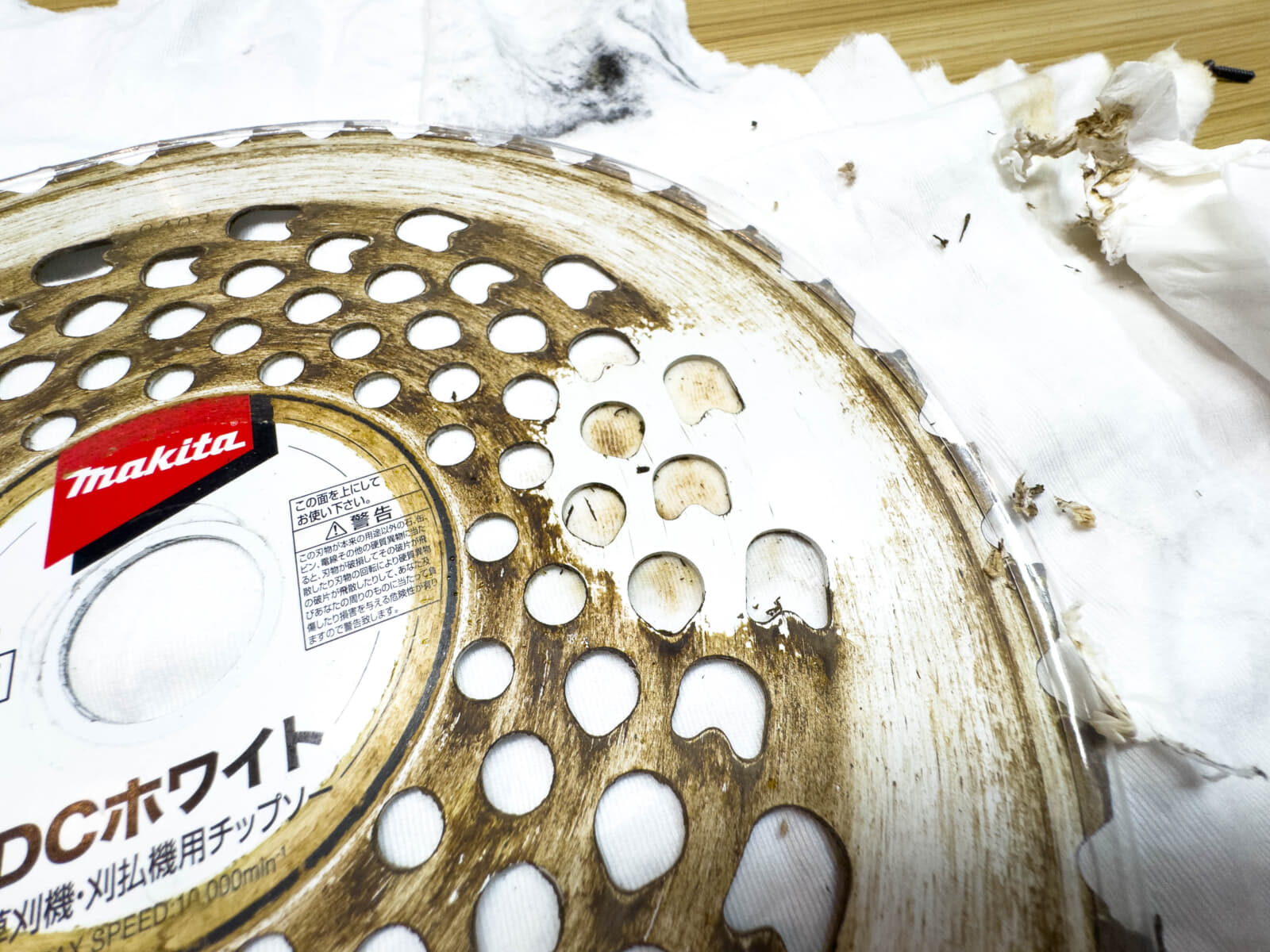 下の写真のチップソーは、数回使ったマキタのDCホワイトチップソーです。刈払機用のチップソーは過酷な環境で使われるので、ホワイト塗装も剥げたり変色して当然と思っている人も多いのではないでしょうか。