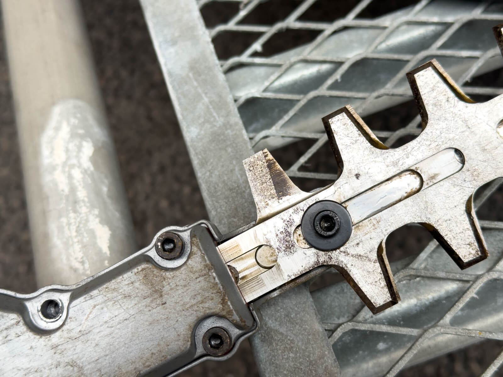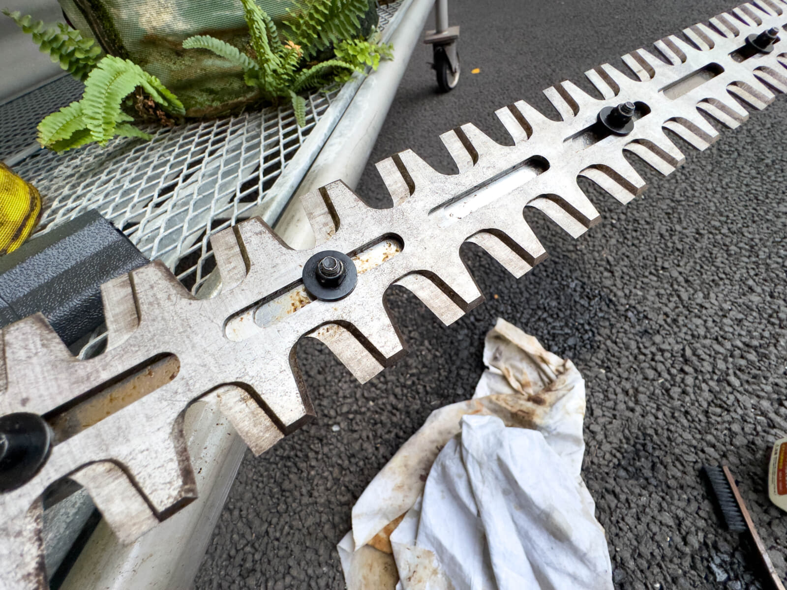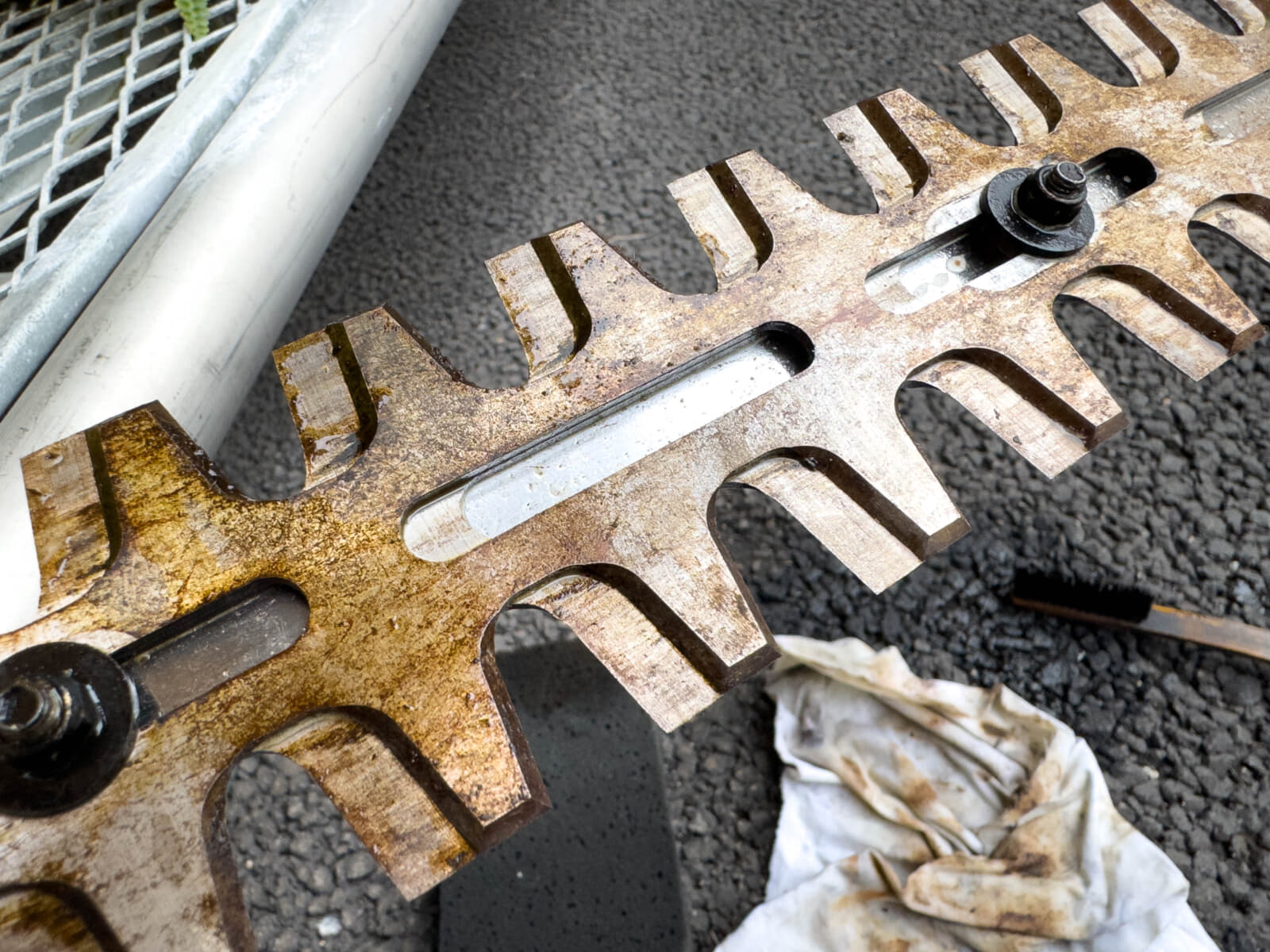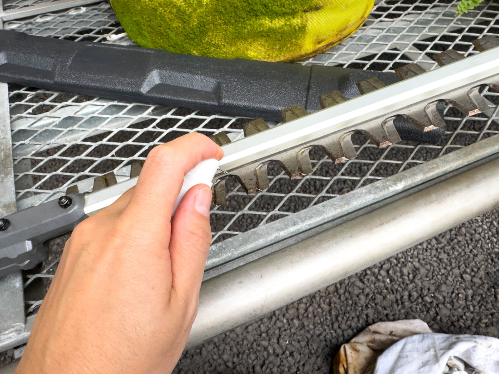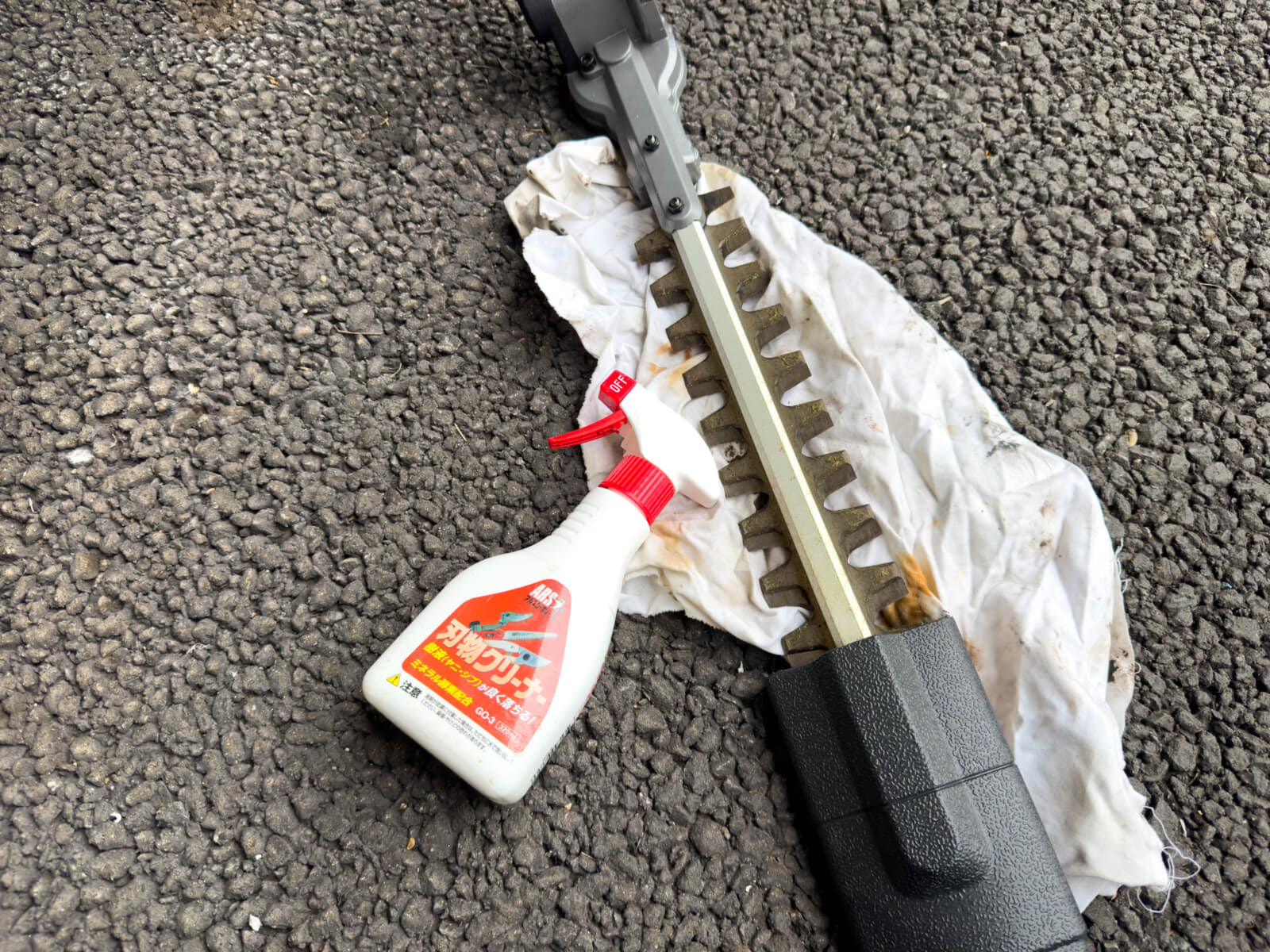 早速、ヘッジトリマに付着した汚れを刃物クリーナーで除去します。ヘッジトリマは構造上ハサミのように刃を交差してせん断する刃物なので、切れ味の劣化やバッテリー消費電力低減のために細かいメンテナンスが必要になります。