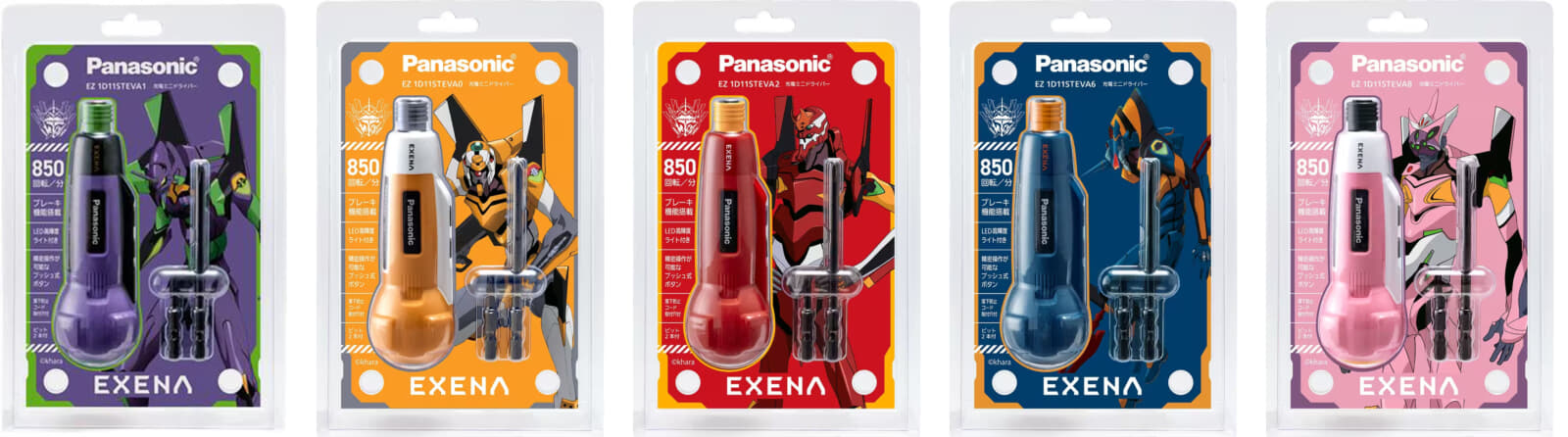 電動工具を製造・販売するパナソニックは、2026年2月にエヴァンゲリオン30周年記念コラボ充電ミニドライバー EZ1D11STEVAを発売する。 2023年5月に発売したEZ1D11をベースにヱヴァンゲリヲン新劇場版に登場した機体をモチーフにした5つの限定カラーを展開する。本体希望小売価格はオープン価格