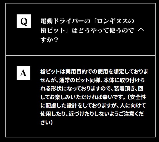 記事執筆時点では初号機モデルの特別仕様パックはすでに完売していますが、ロンギヌスの槍ビットが付属する点も遊び心に溢れた良いコラボだと思っています。公式でも「ロンギヌスの槍ビットが付属されていますが、実用性は全くありません。装着して回転させてその様子を楽しんで頂けたらと思います(笑)。」と紹介されており、企画側が楽しんでいる雰囲気が伝わってきます。