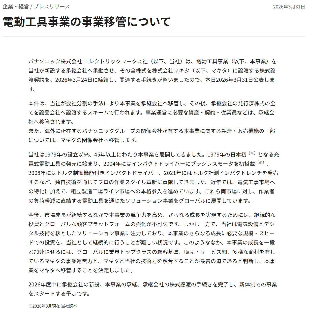 新会社の設立および株式の譲渡は2026年度中に実施されることが開示されていますが、譲渡後のパナソニックブランドの扱いや既存販売品に対するパナソニック電動工具のサポート等の新しい方針は現時点では開示されていません。
