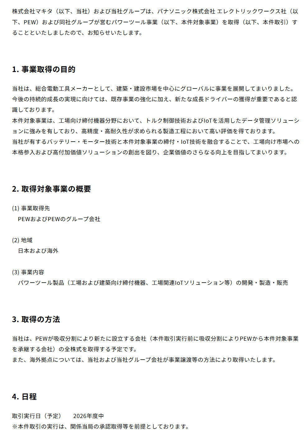 この事業移管は、EW社の電動工具事業を会社分割によって事業を継承する新会社に移管し、その後に新会社の全ての株式を株式会社マキタへ譲渡する手法の事業移管となり、パナソニック電動工具事業が持つ資産・契約・従業員等はマキタに継承されます。