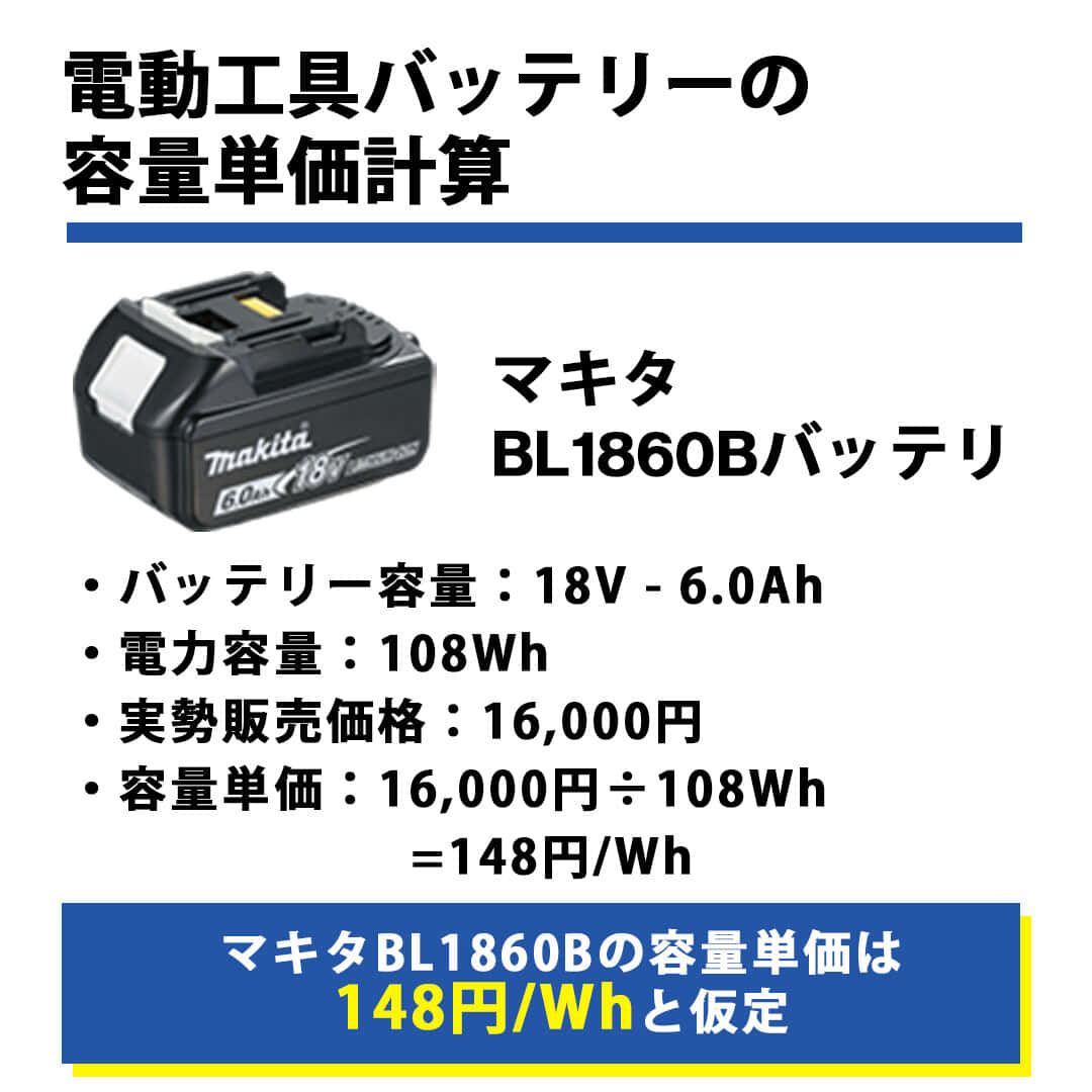 ここからの検証では、マキタBL1860Bバッテリの1Whあたりの容量単価148円として計算します。