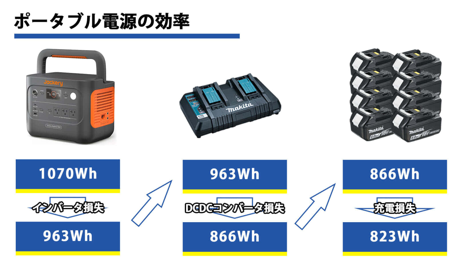 - ポータブル電源は変換回路の損失 (インバータ90%×充電器90%×バッテリ受電効率95%≒76%) を含む実効容量で比較
