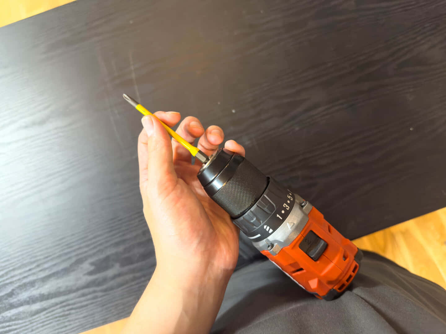 ドライバドリルのビット装着は、チャックと呼ばれる部品にビットを噛ませることで固定する構造になっています。チャックは手で回せるようになっていて、ビットを差し込んで手で締め付けることで固定ができます。