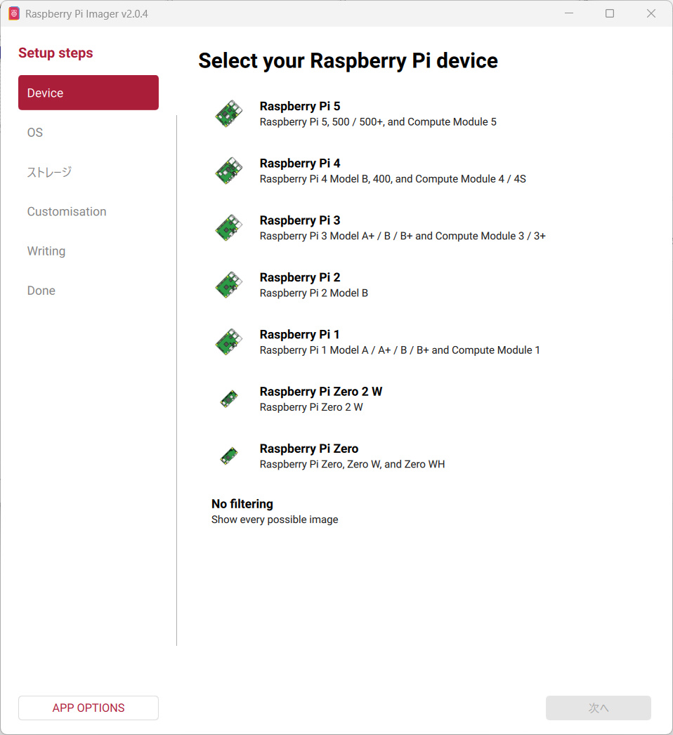 最初のステップでは、使用するRaspberry Piを選択します。今回はRaspberry Pi 3を使用するので、それを選択して次へボタンを押します。