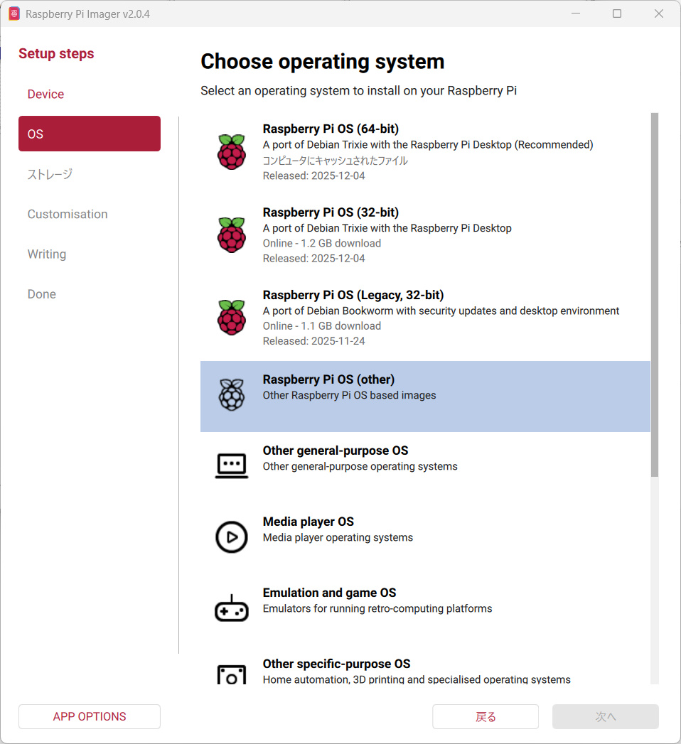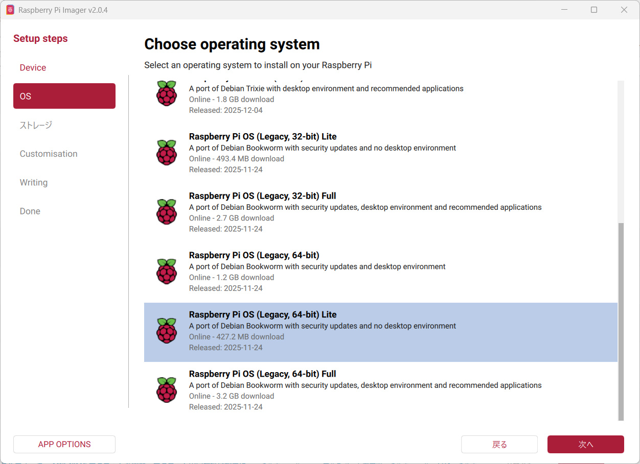 Raspberry Pi OS (Legacy, 64bit) Liteを選択して次へを押します。
