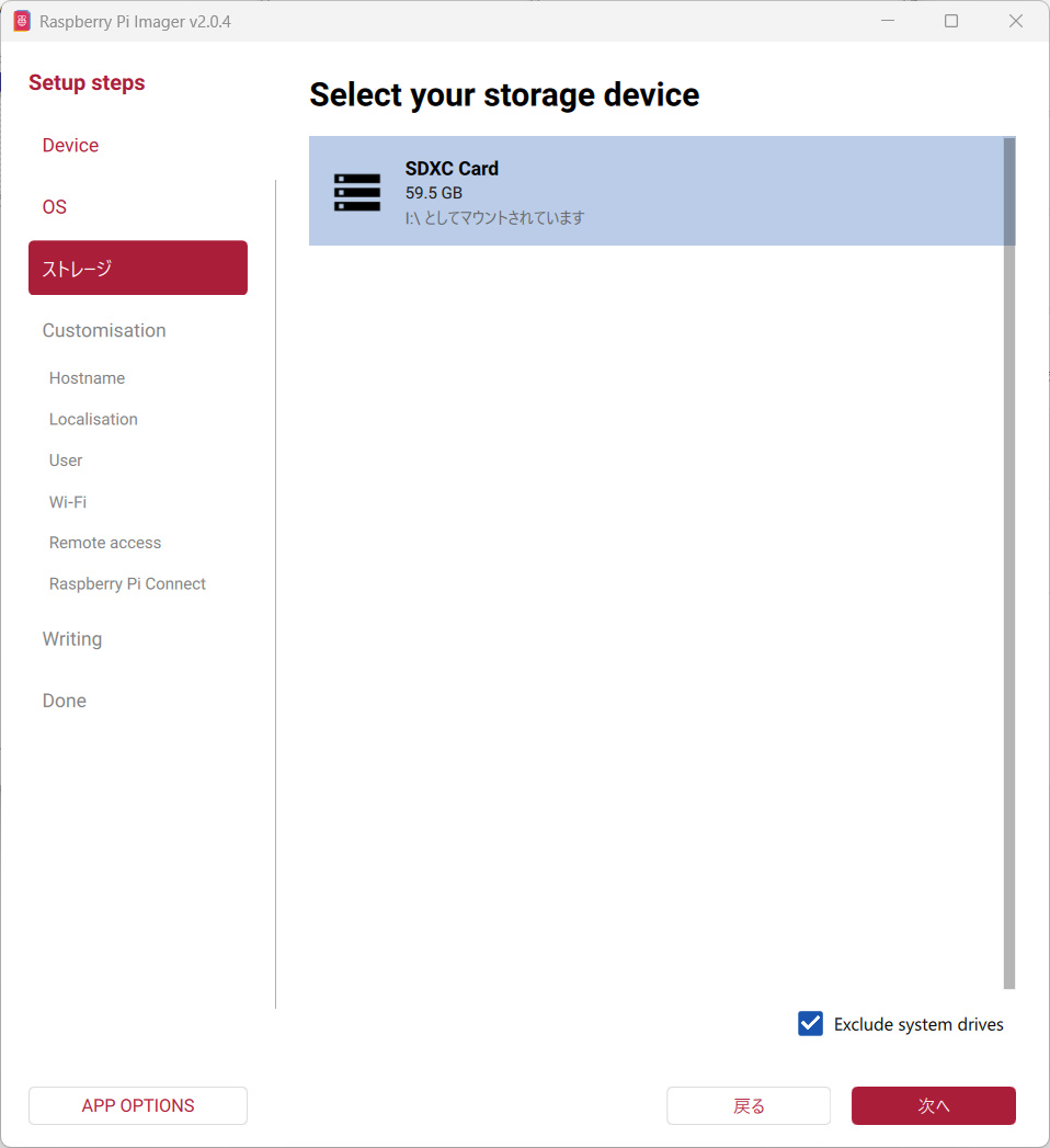 ストレージを選択します。今回は64GBのmicroSDカードを使用します。