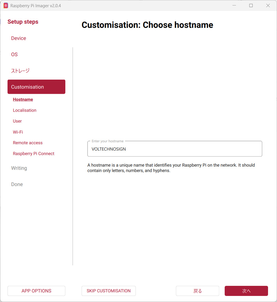 ここからはインストールするRaspberry Pi OSのセットアップ情報を入力します。ホストネームやユーザー名、Wi-Fiの設定やSSHの有効化などを行います。