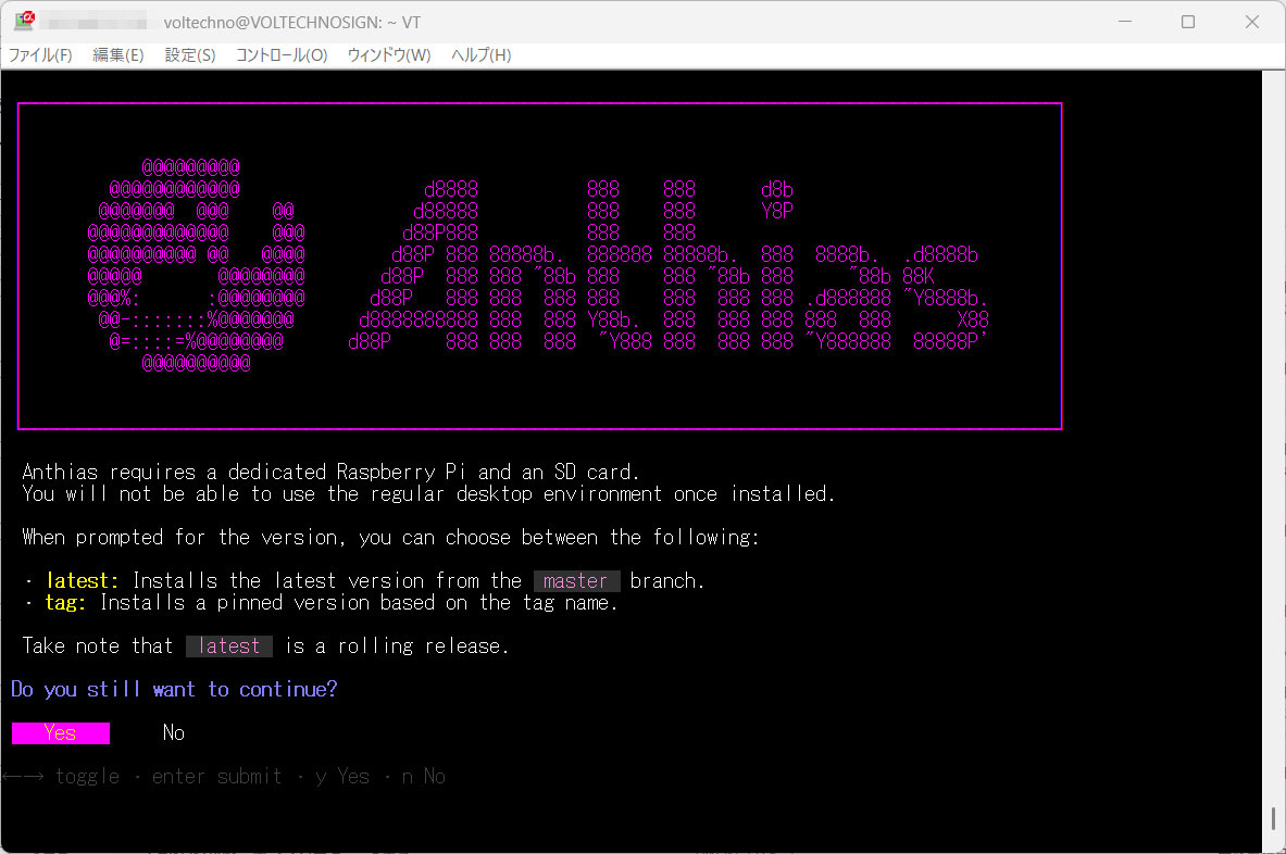 Anthiasのロゴを模したAAが表示され、Yes/Noやネットワーク管理方法・バージョンなど確認されるので、特に不都合が無ければエンターキーを数回押してインストールに進みます。