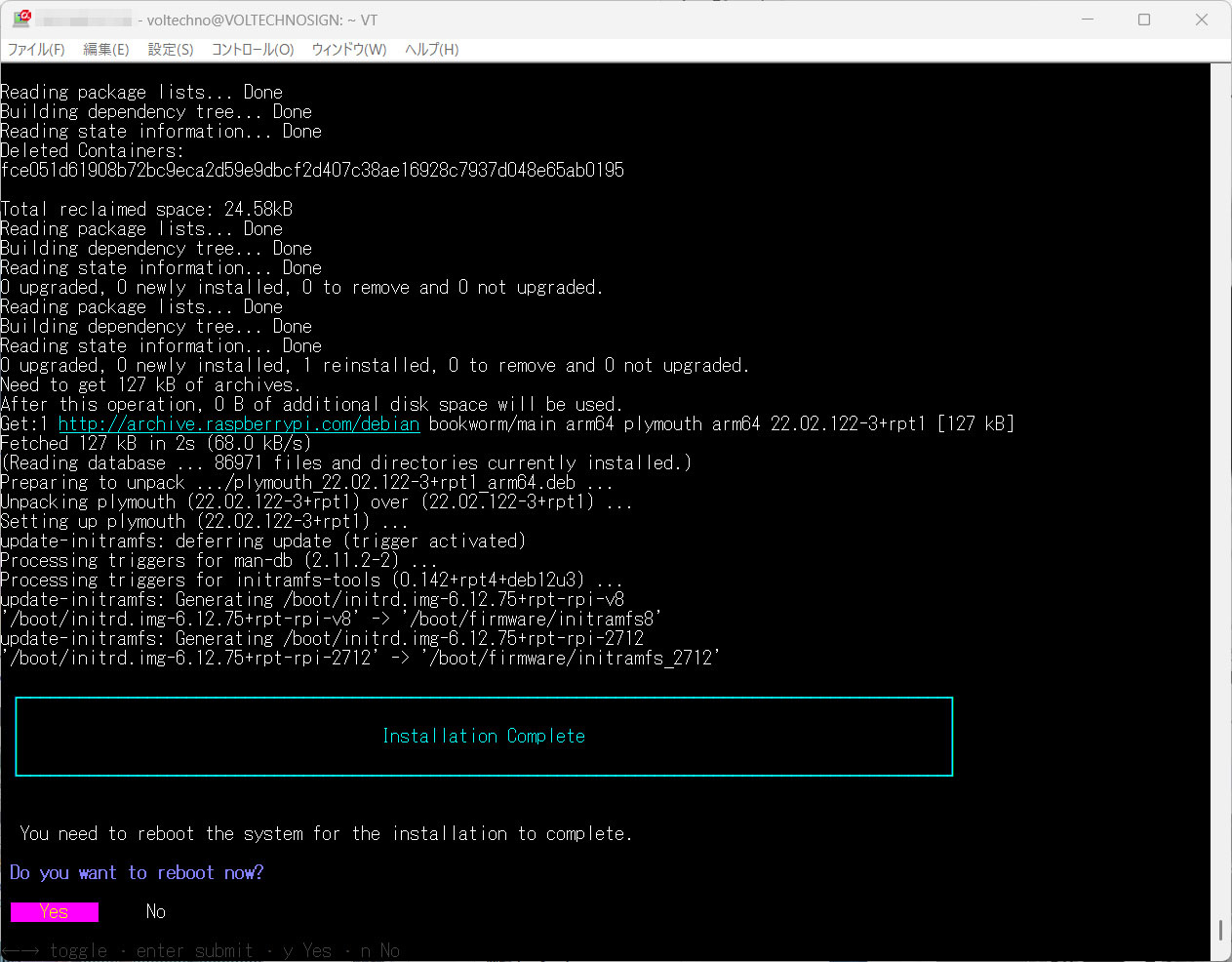インストールが完了すると「Do you want to reboot now?」と再起動を促されるので、Yesを選択して再起動します。