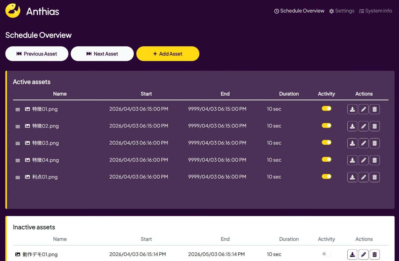 このブラウザ上の管理画面から、アセットの追加や削除、表示したい時間などを管理します。アセットは画像や動画など一般的なデータの他にも