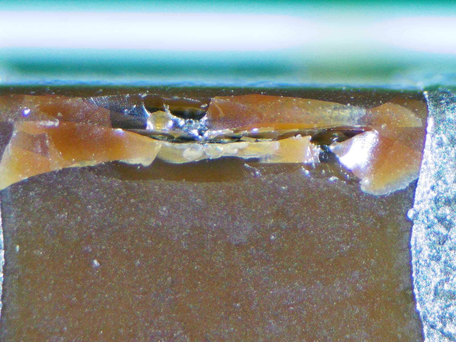 さらに拡大した写真がこちら。ひび割れしたところの内部が露出しており、溶けた金属片が付着しているように見えます。これは積層間の内部電極が接触して短絡している状態なのかもしれません。