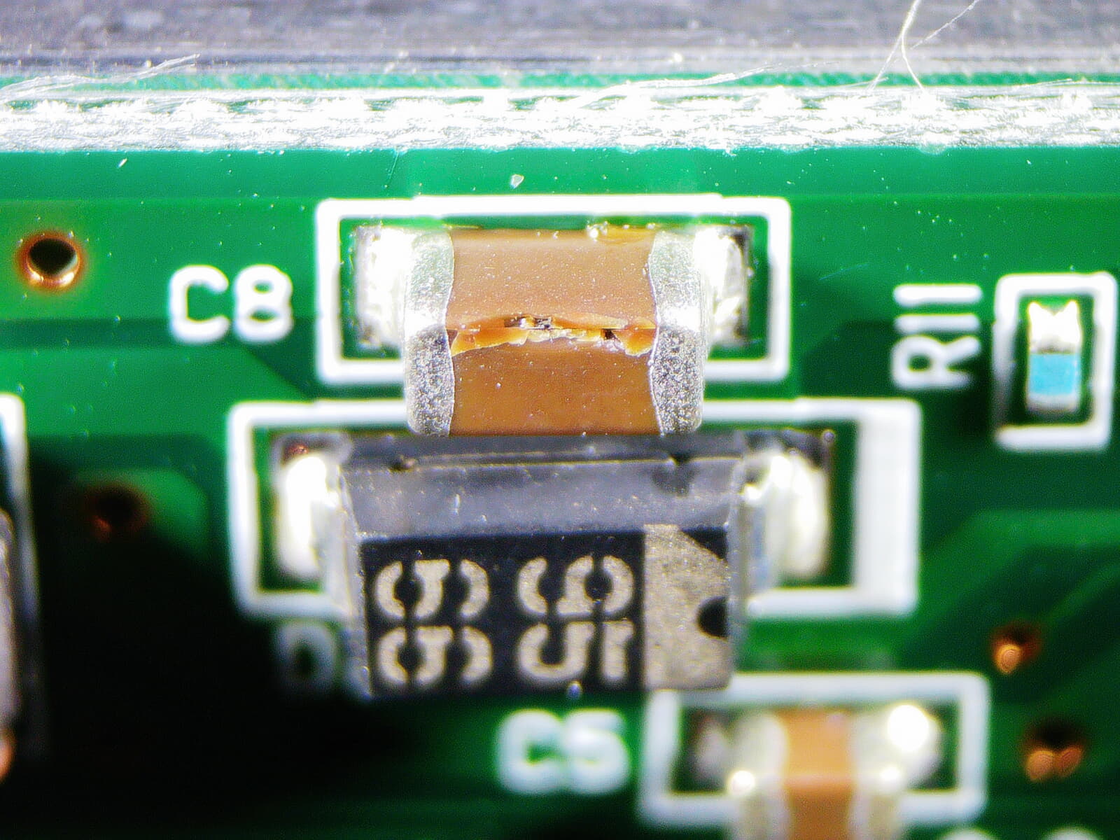さて、今回のようなセラミックコンデンサのクラック形状は色々な製品で発生しやすい不具合現象らしく、よくある事例としてはノートパソコンの電源回路の修理では横割れしているセラミックコンデンサの症例が多くみられる故障モードのようです。