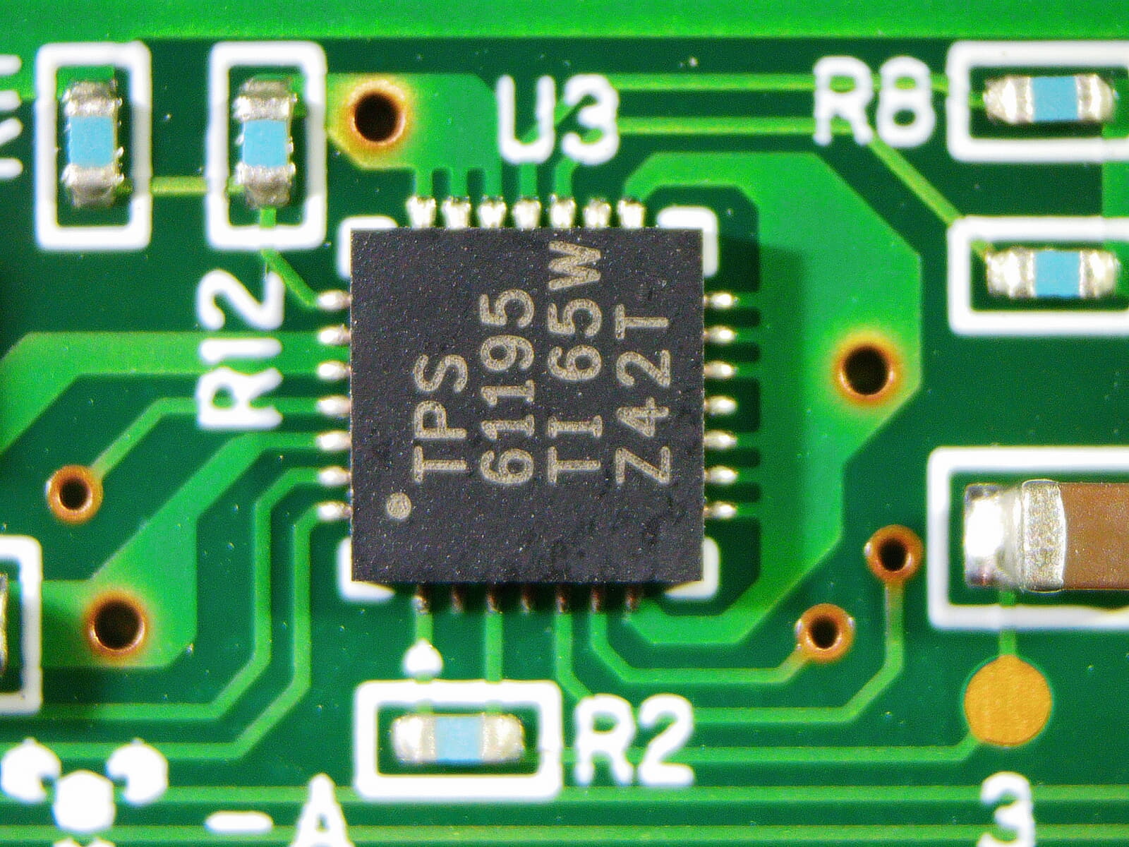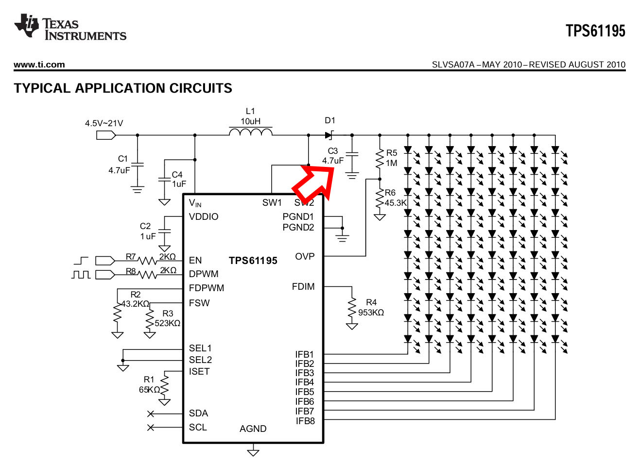 コンデンサは割れてしまったため元の容量はわからなくなってしまいましたが、調光にTIのLCDバックライト向けLEDドライバIC TPS61195が採用されていることが分かったので、データシートのリファレンス回路を参考にしてコンデンサを付け替えることにします。