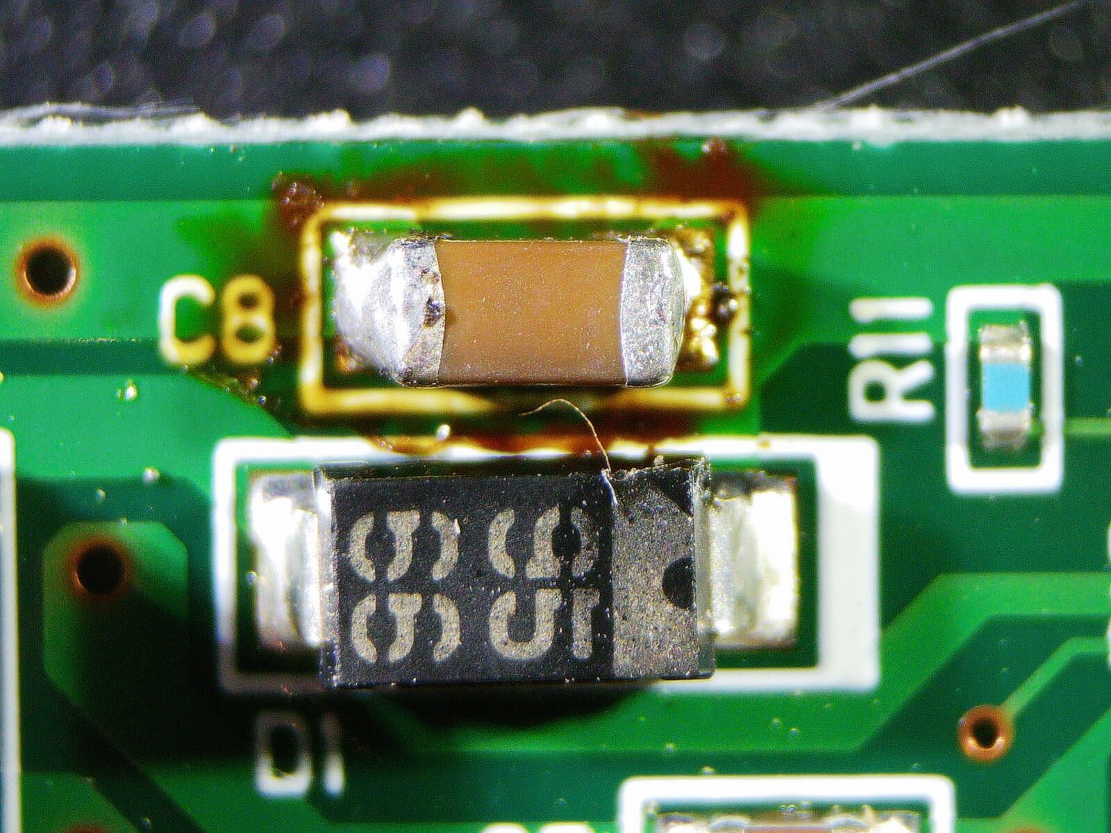 少し探すと、C8に位置する3216サイズのセラミックコンデンサが変な形をしていることに気付きました。