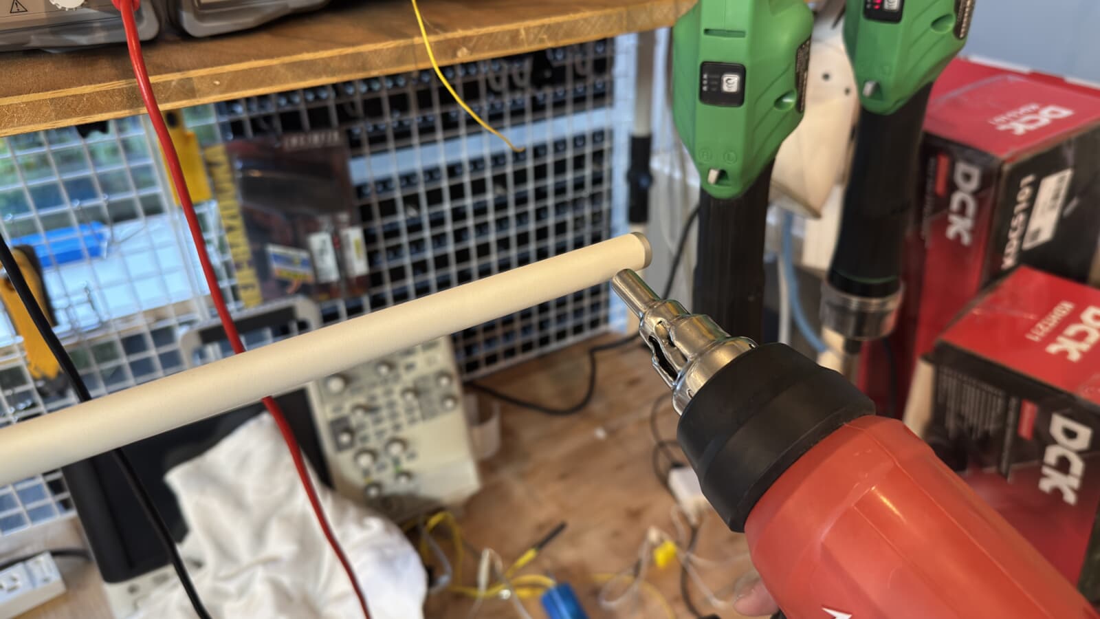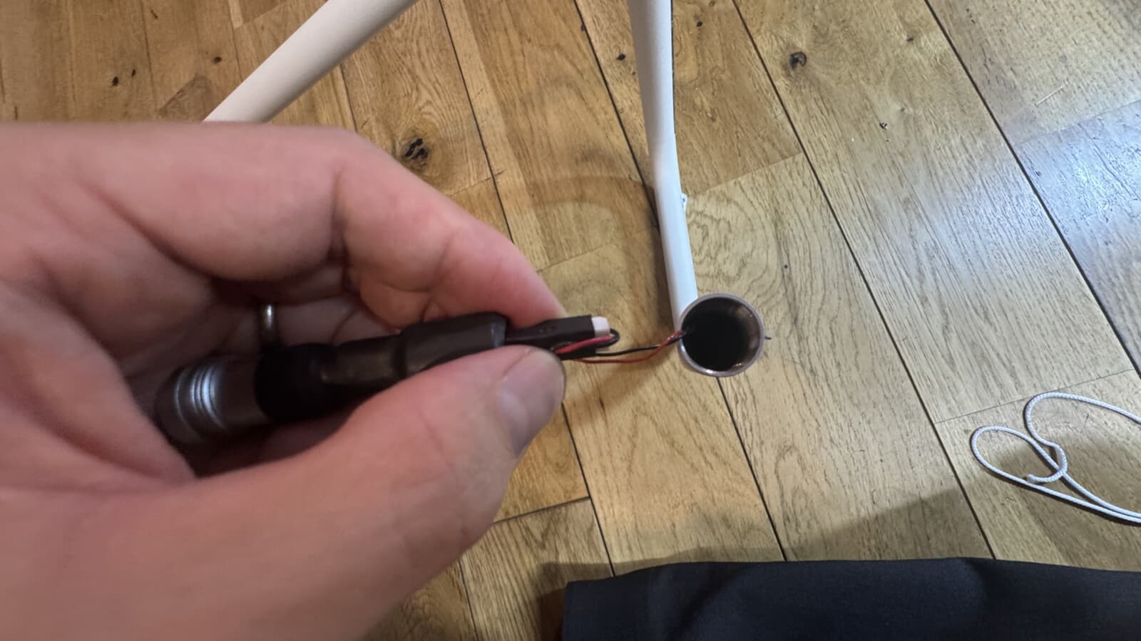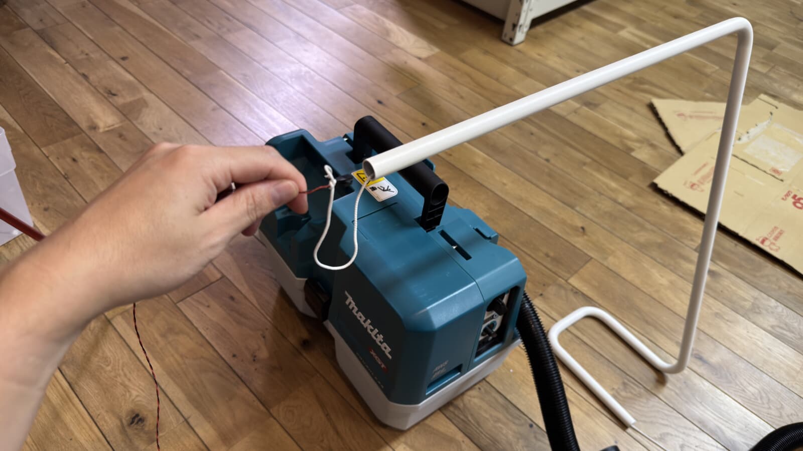 回路の修理が完了したので元通り組み立てます。筐体のパイプの中に紐を通したあと掃除機で吸い取って反対側に紐を出して、結んだコネクタを手繰り寄せて反対側にコネクタを通します。