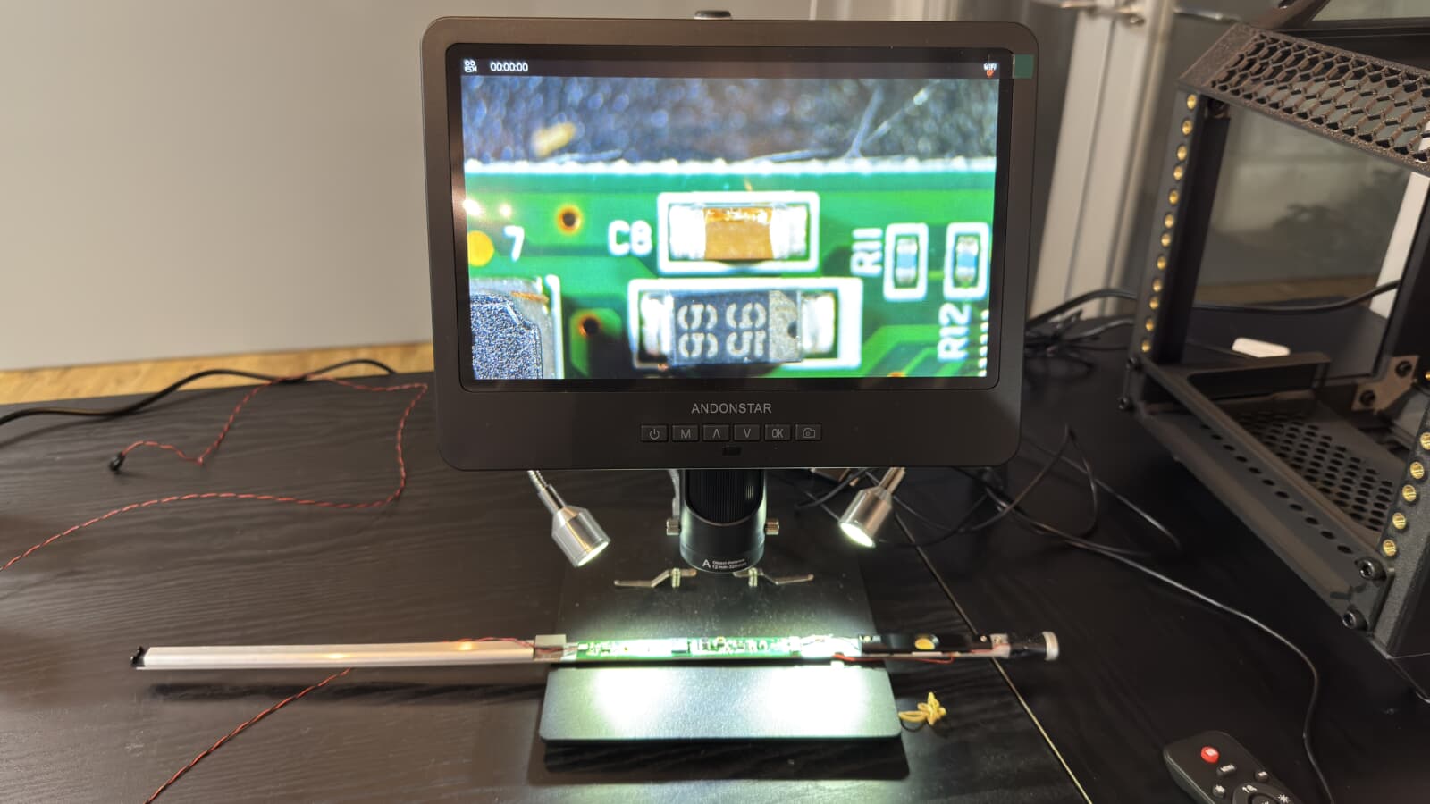 コンデンサの状態を確認するためにマイクロスコープを取り出して確認します。
