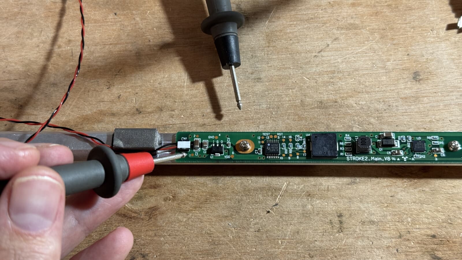 恐らく、これはSTROKEの内部回路に大電流が発生する状態になっており、それをACアダプタ側の過電流保護が保護停止と動作再開を繰り返していることで発生している挙動と考えられます。この場合、回路のどこかでFET焼損かコンデンサの短絡が発生している可能性が高いので、目視で回路の異常を探します。
