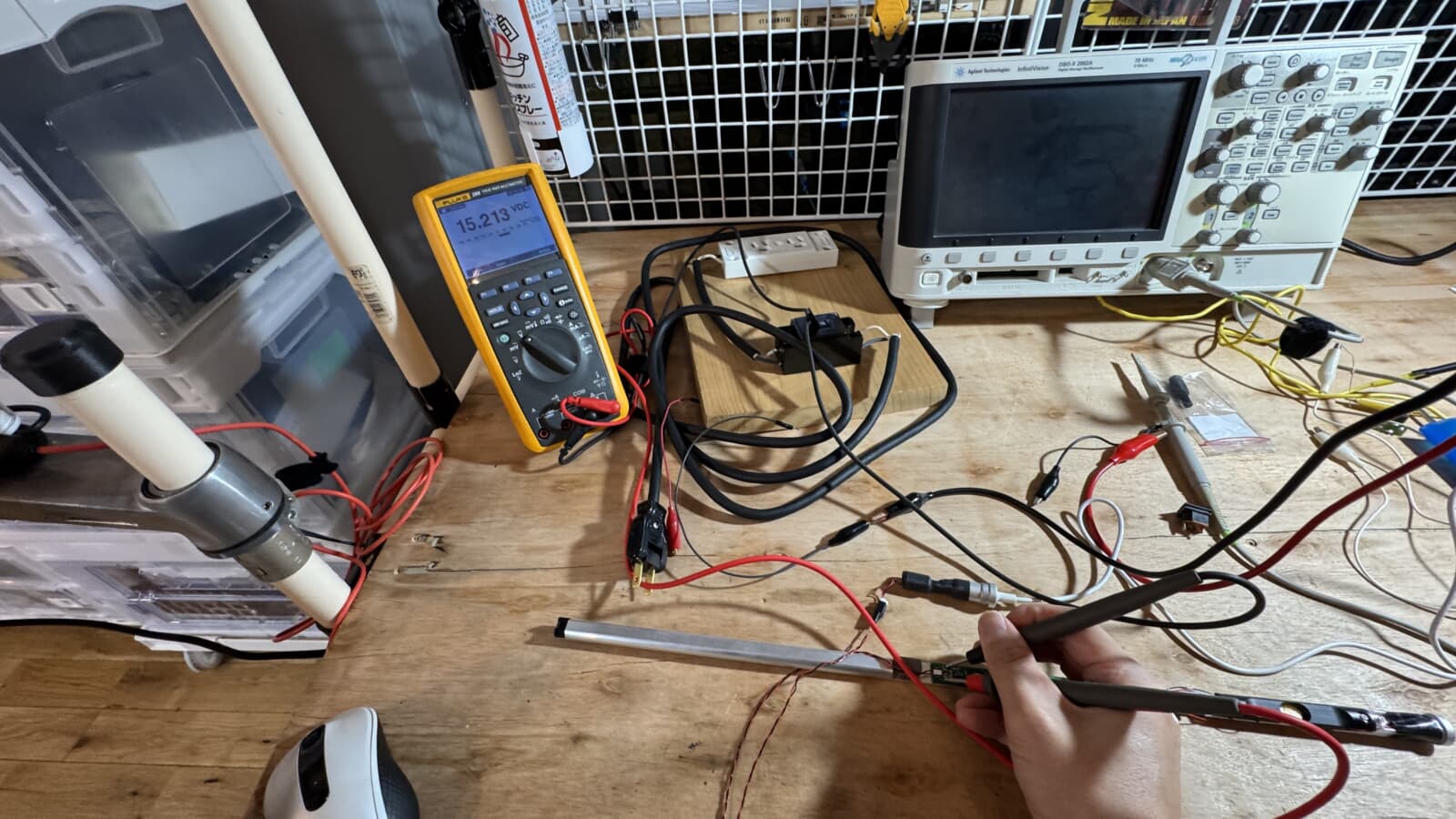 直流電源で数Vを加えて様子を見て問題なさそうだったので、ACアダプタを装着して入力部の電圧を確認します。想定通りの15Vが出ていました。