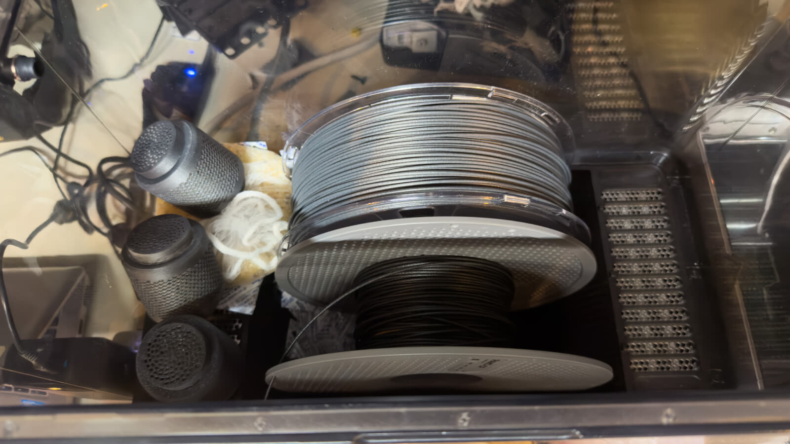 そのため、Space Piを使っていた頃は常に70℃設定で24時間連続乾燥していましたが、造形量によっては乾燥が追い付かないこともありました。PAフィラメントの造形を主体に運用するのであれば、70℃を超えるフィラメントドライヤーは必須だと考えています。