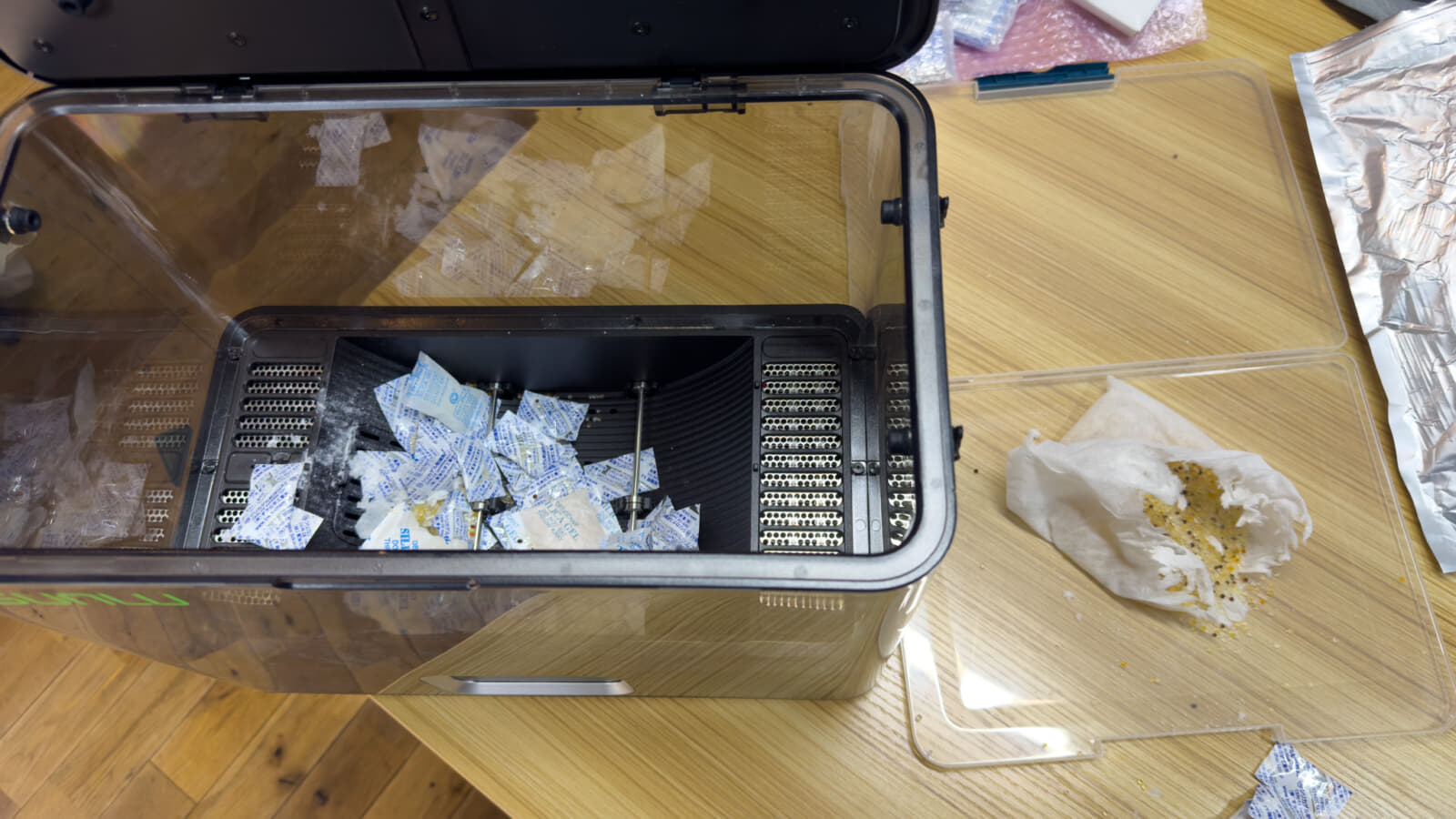 そんな感じで、電子部品やフィラメントに付属しているシリカゲルをSUNLU E2に入れて85℃乾燥をしていたのですが、ある日シリカゲルを取り出してみると、不織布包装のシリカゲルが飛散していました。