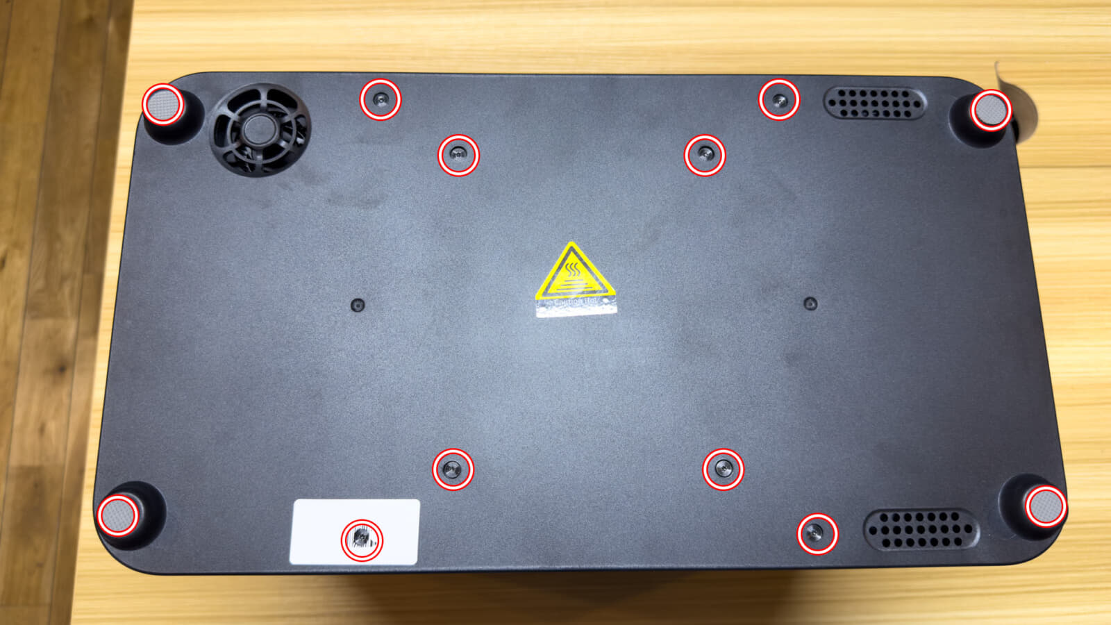 SUNLU E2の分解は簡単で、底面の10カ所のネジを外すと底蓋を外せます。ネジ頭形状なのはトルクスなのでトルクスビットを用意しておきましょう。