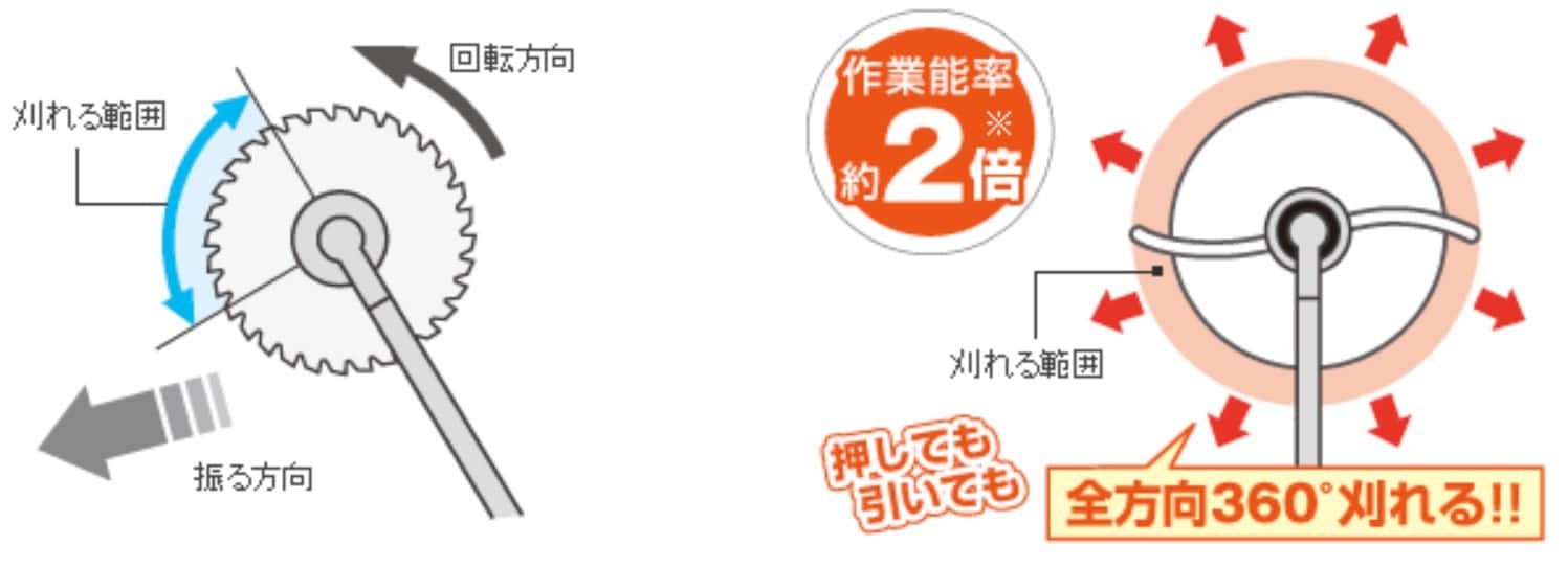 ナイロンコードカッターは、コードが回転している外周部全てが草刈範囲なので広い作業面積を持つのが特徴です。