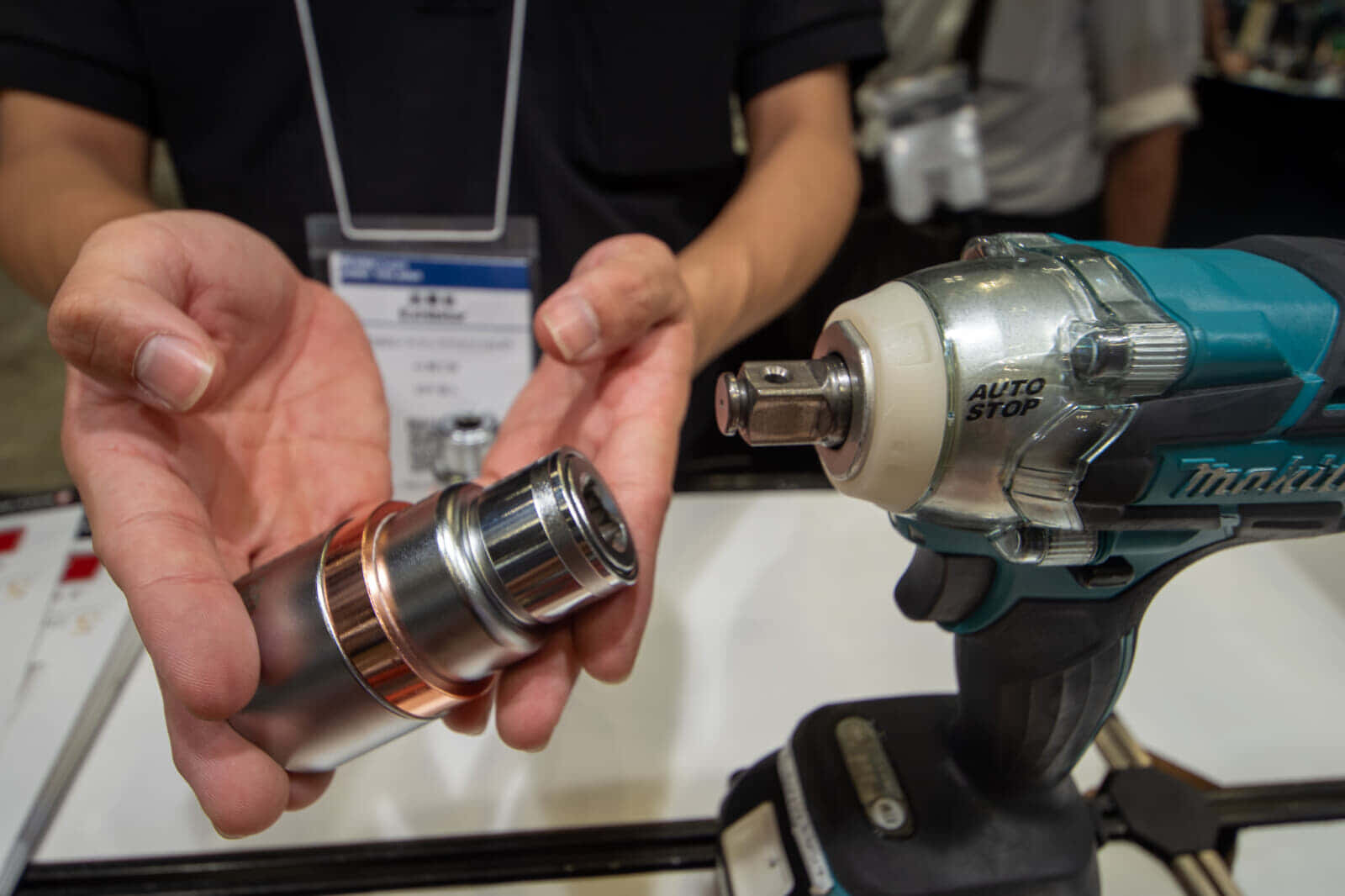 電動工具向けのアクセサリを展開するイチネンアクセス MUSTTOLLの新製品 5サイズソケットが展示されていました。