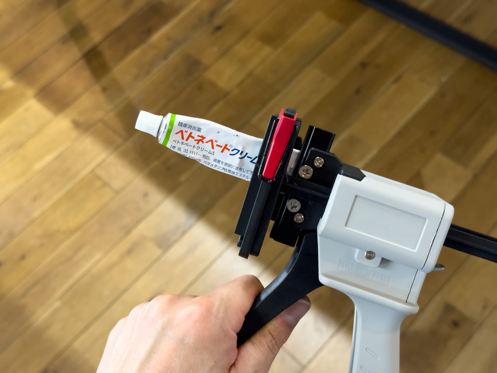 このチューブディスペンサーは、コーキングガンのようにトリガー操作で吐出できるのが特徴で、コーキングガンで使われる333mLのカートリッジを用意しなくても、チューブ容器のまま同じように使うことができます。
