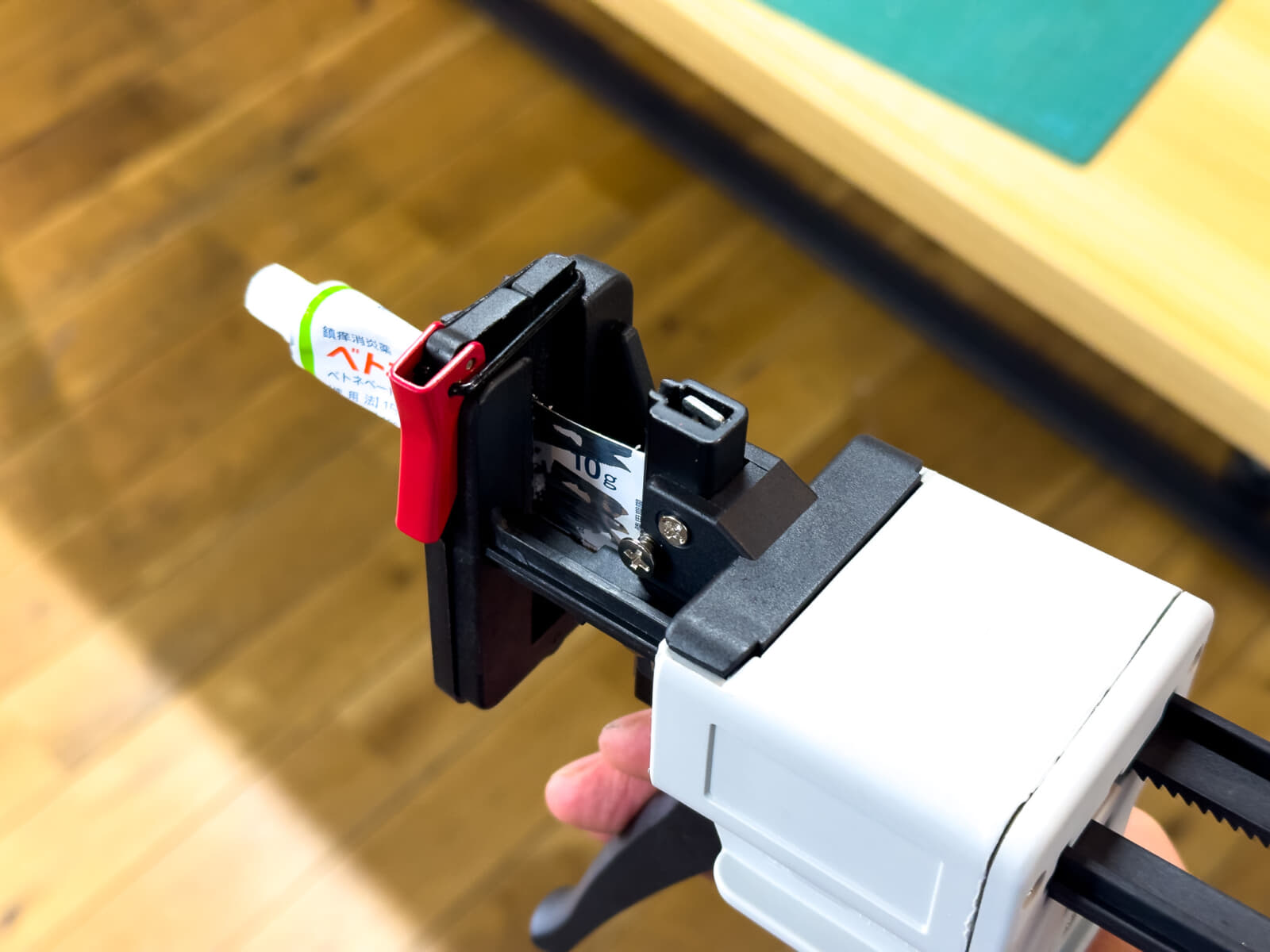 チューブ入りの接着剤やグリスを使う時、初めは握るだけで吐出できても使うごとに内容量が減っていき、最後の方はがんばって絞ってもチューブの中に余ってしまう、なんてこともあるのですが、このチューブディスペンサーを使えば最後まで絞り出すことができます。