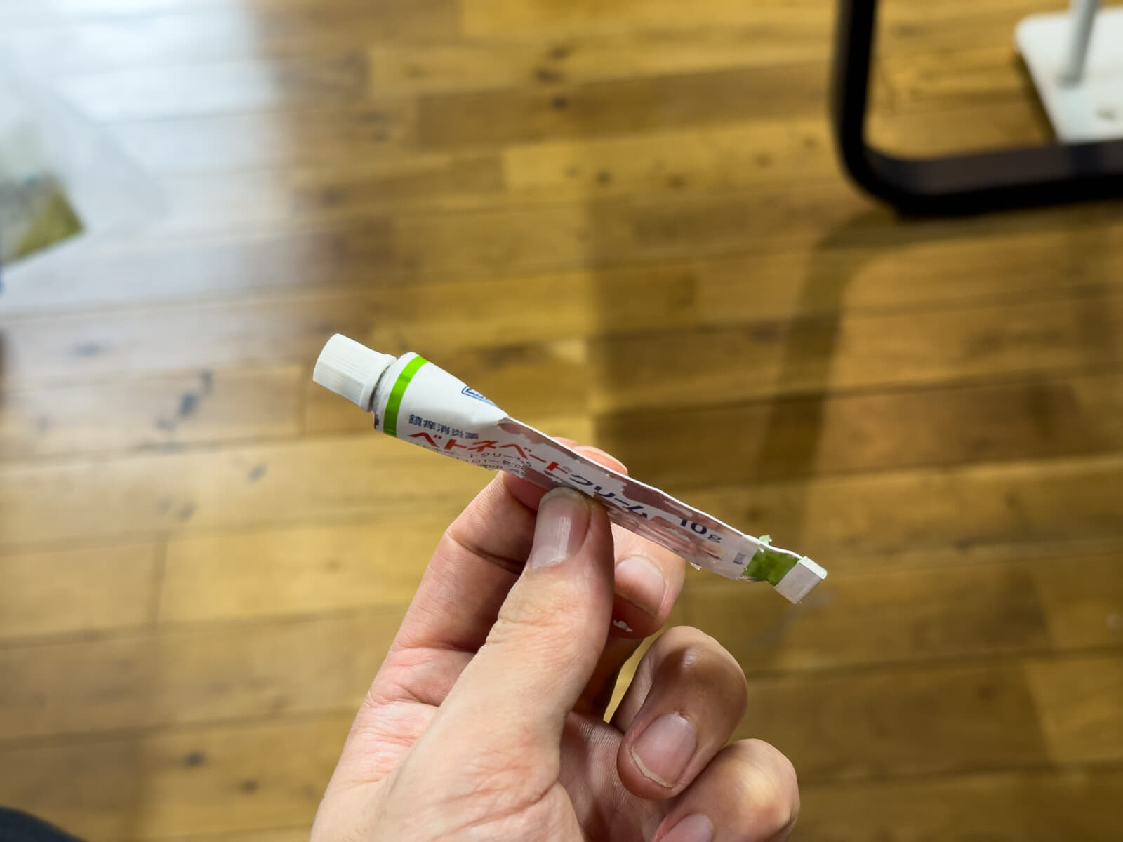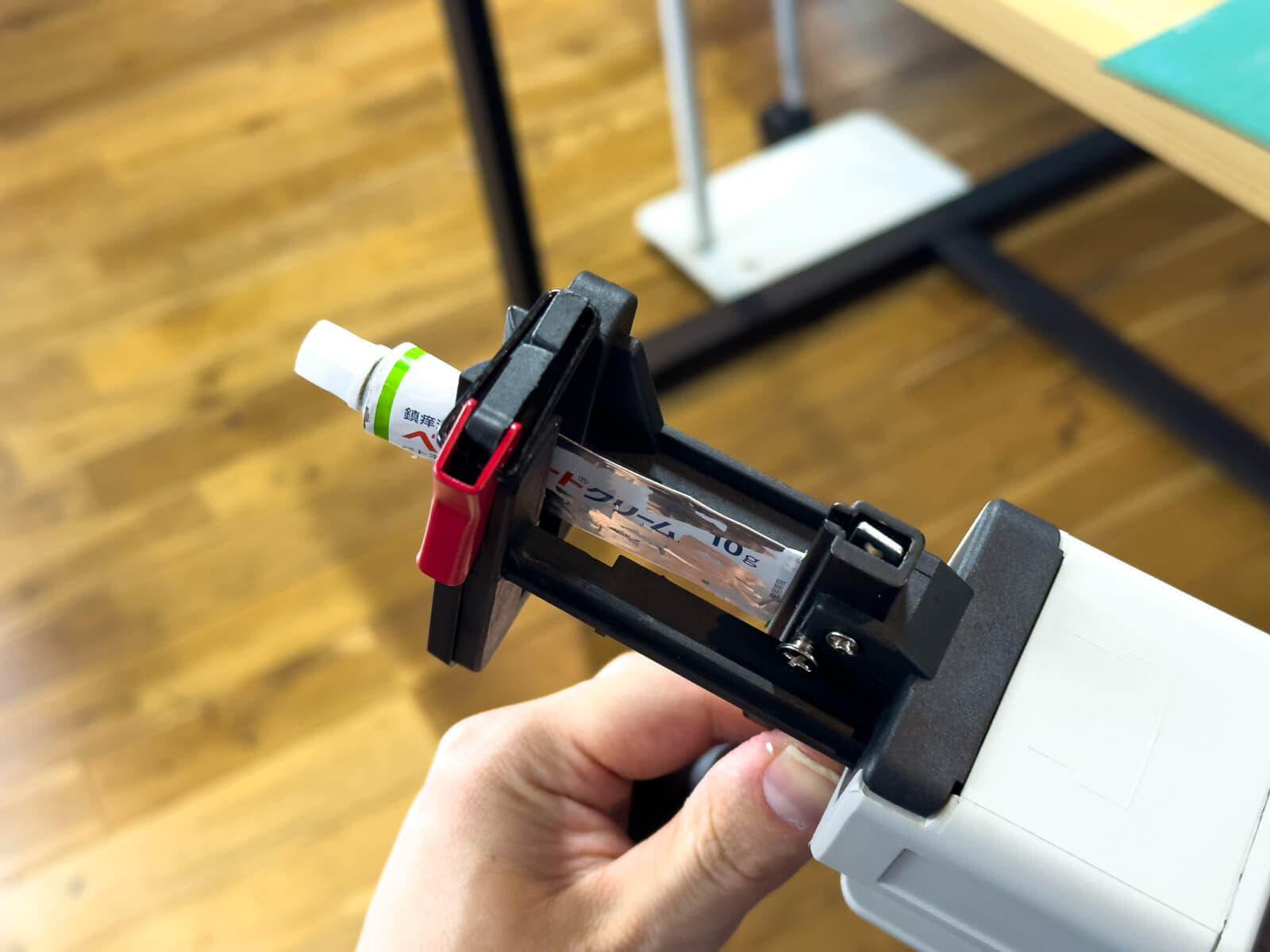 対応サイズ内であれば、小さいチューブの絞り出しにも対応できます。下の写真は、薬局で売っているアルミチューブの塗り薬です。