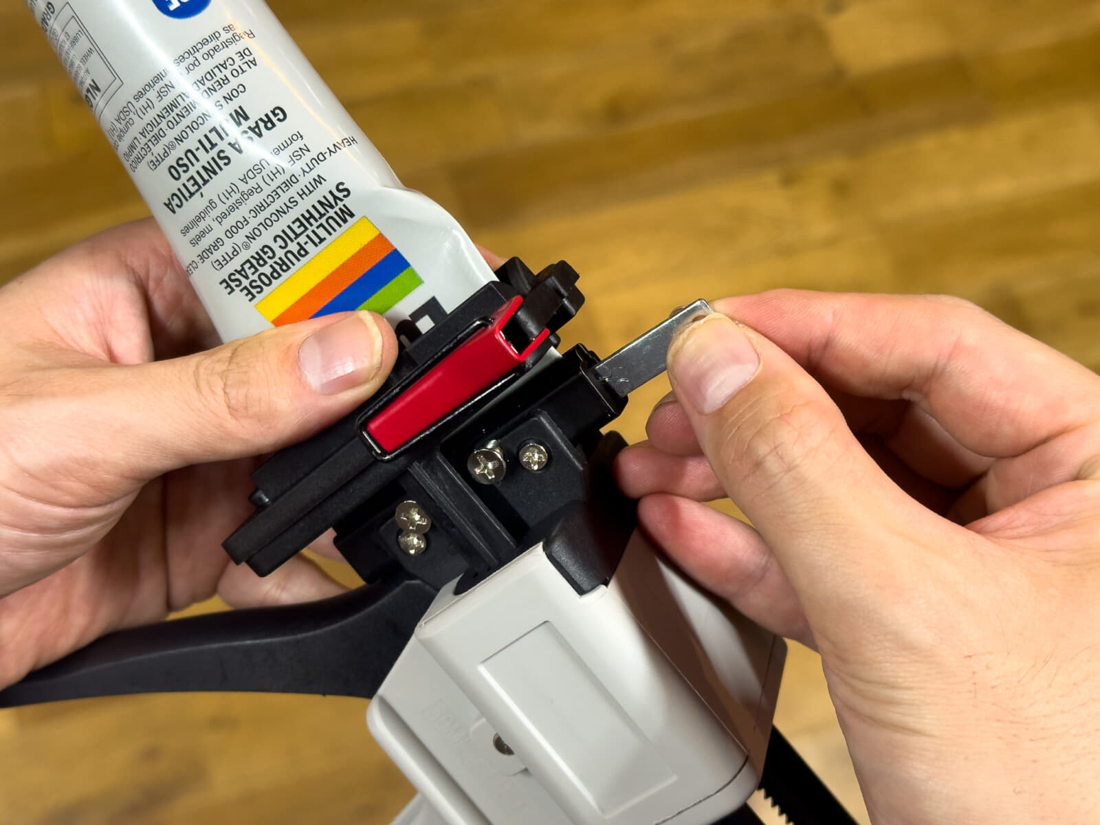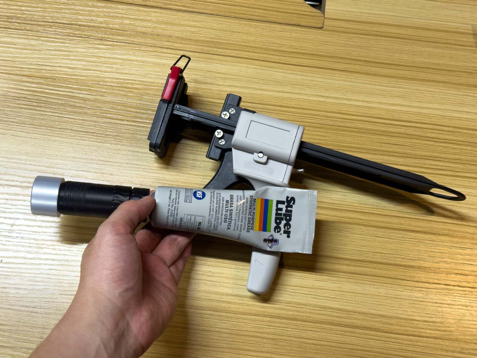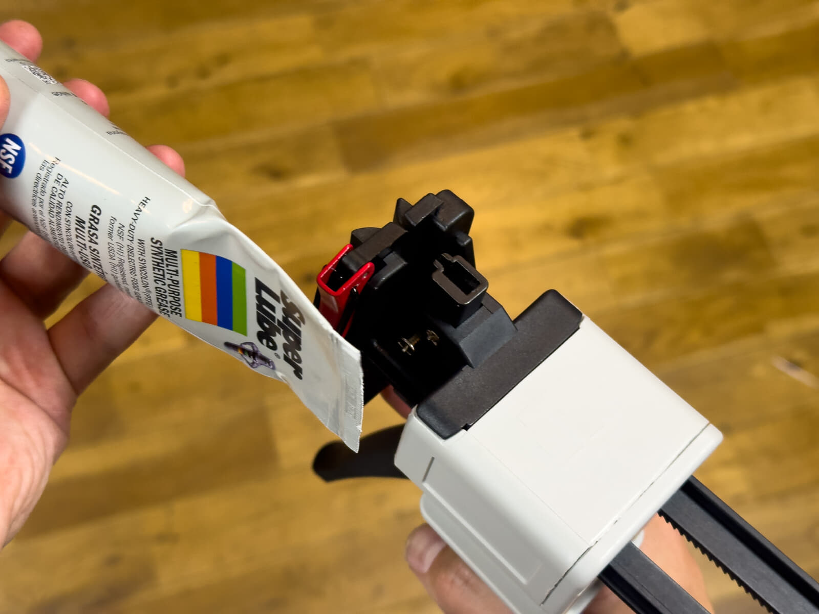 このSuper LubeにはMaker Worldで見つけたスクリュー塗布アダプタを装着しています。このアダプタを付けていると、少し力を入れてグリスを絞り出さなければいけないのですが、チューブディスペンサーを使うと出し過ぎてしまうくらい簡単にグリスを塗布できます