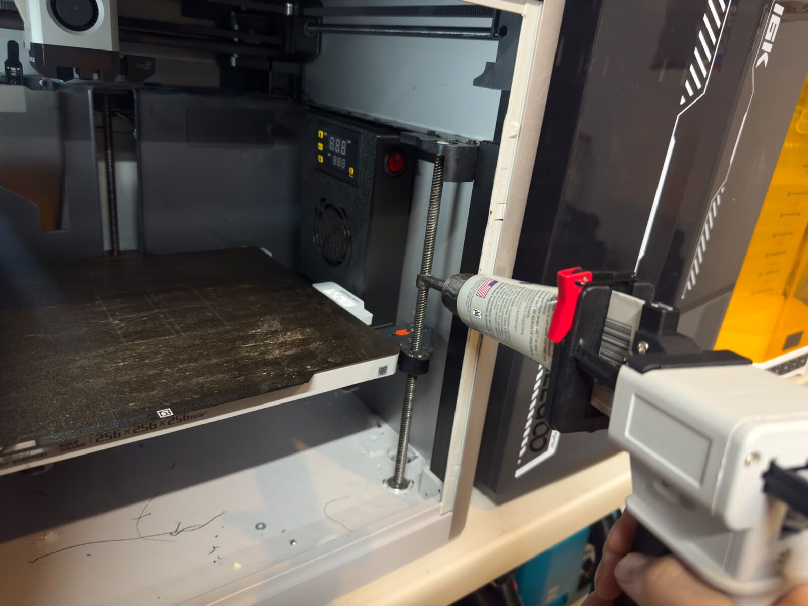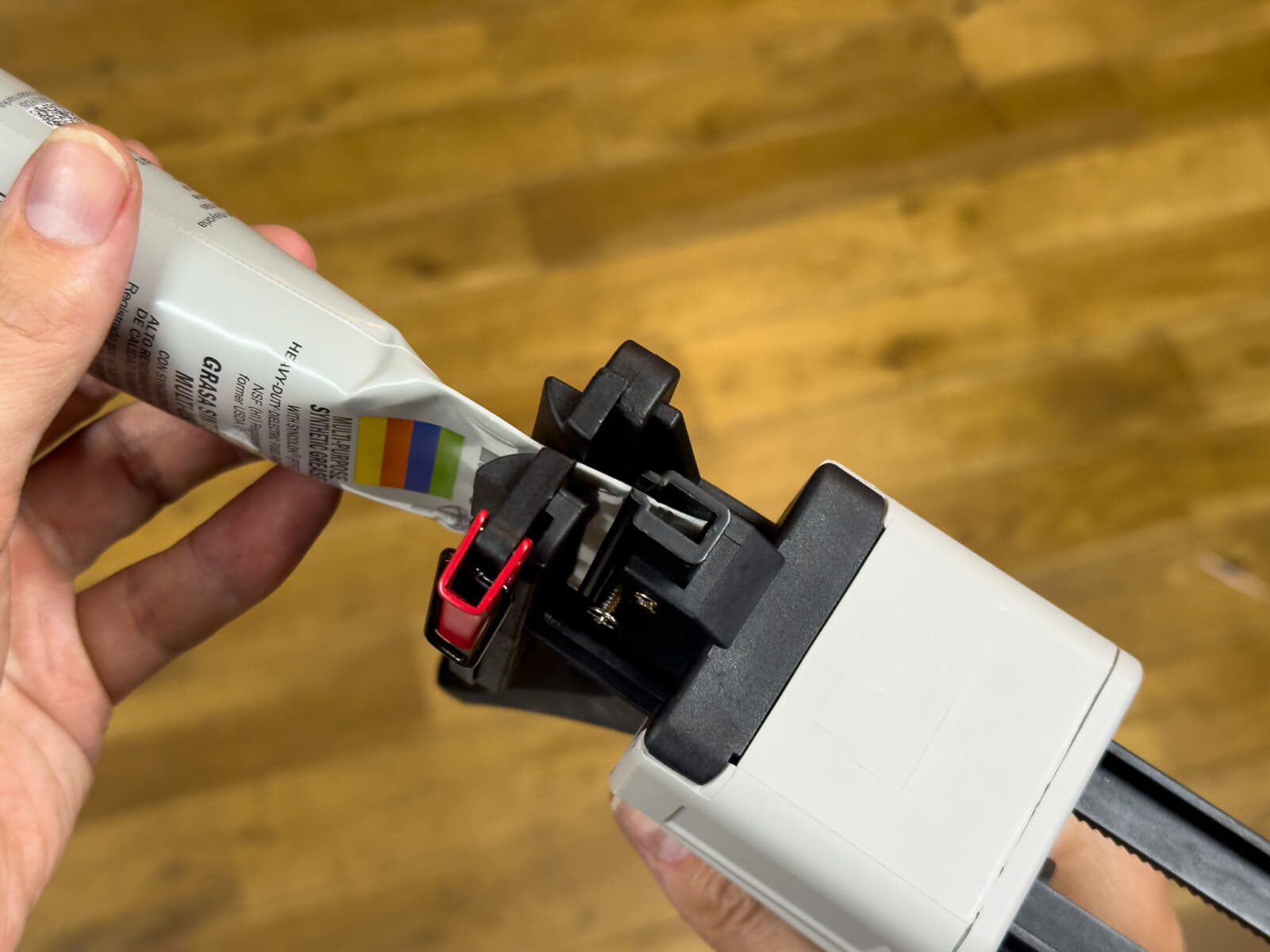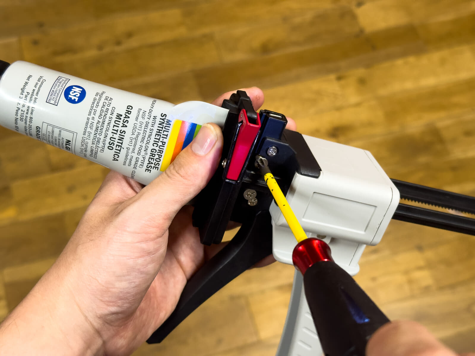 このSuper LubeにはMaker Worldで見つけたスクリュー塗布アダプタを装着しています。このアダプタを付けていると、少し力を入れてグリスを絞り出さなければいけないのですが、チューブディスペンサーを使うと出し過ぎてしまうくらい簡単にグリスを塗布できます