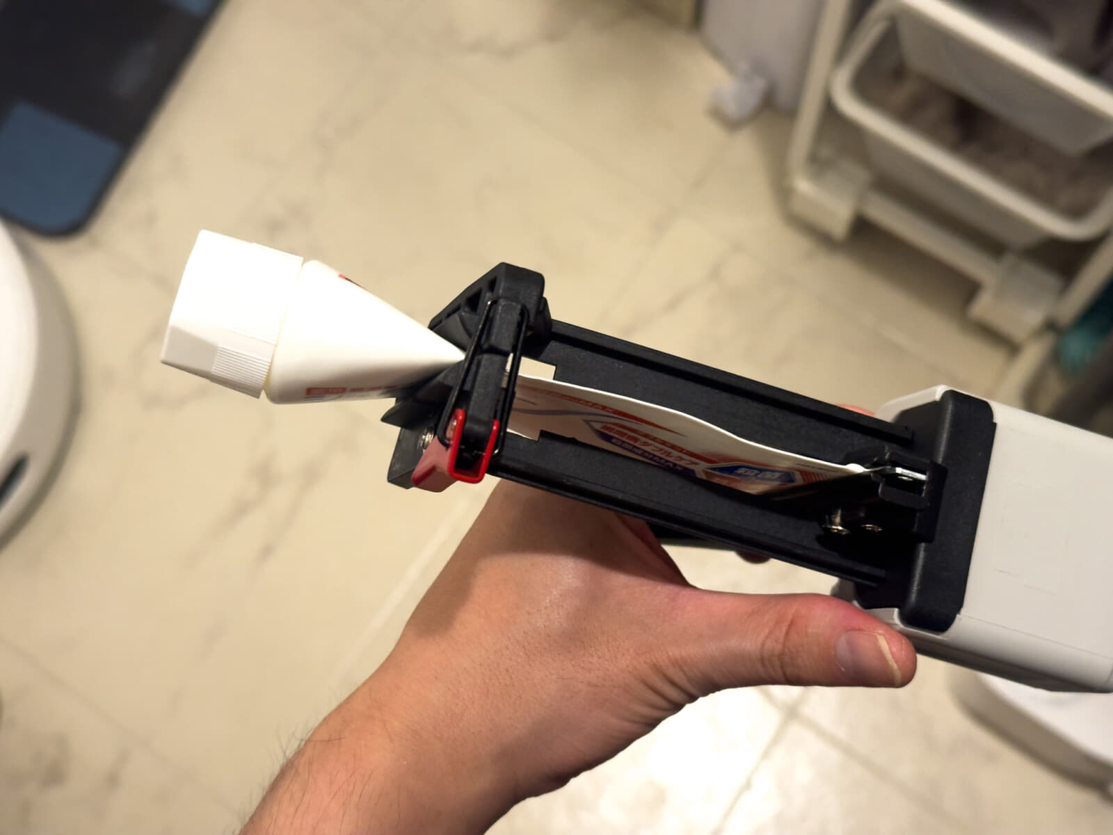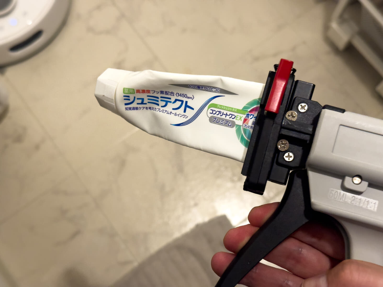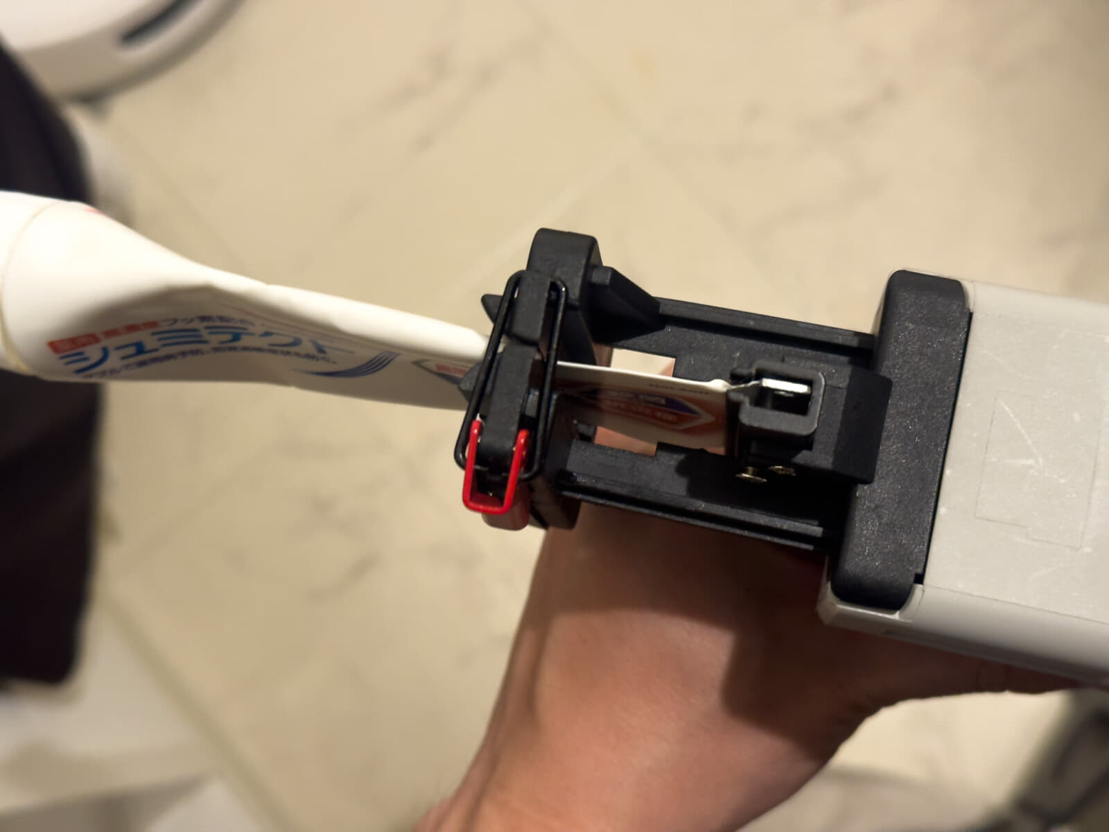 先ほどと同じように歯磨き粉のチューブをチューブディスペンサーに固定して、トリガーを引けば絞り出せます。