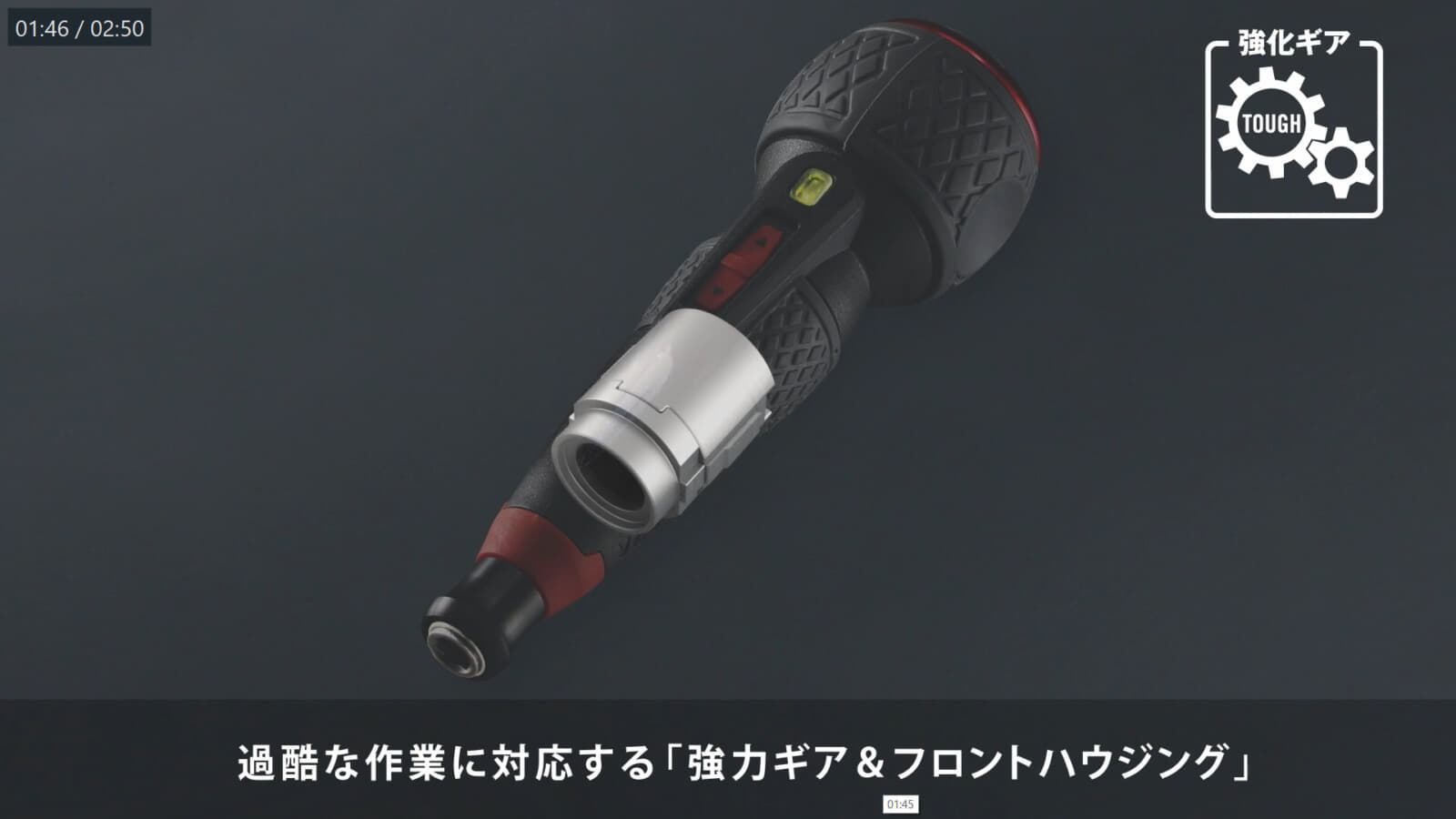内部ギアとフロントハウジングを強化し、従来比20%増の耐久性向上を実現。これにより電ドラボールⅡ本体の耐久性が向上しただけでなく、手締め時の最大締付トルクも向上して最大12N・mまで加えられるようになりました。